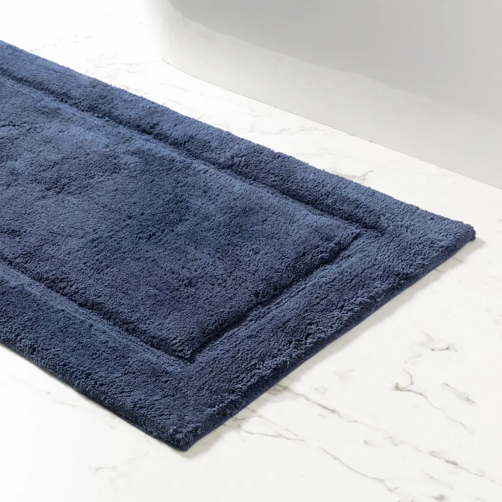 This plush bath mat is woven of combed Turkish cotton with low-twist yarns for added softness and thirst. Finished hems and a single border give it a clean, modern look.