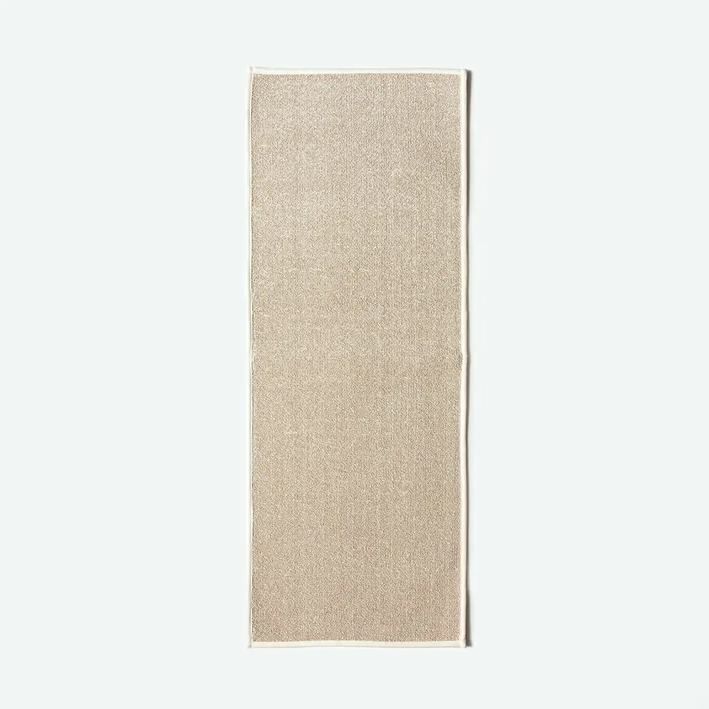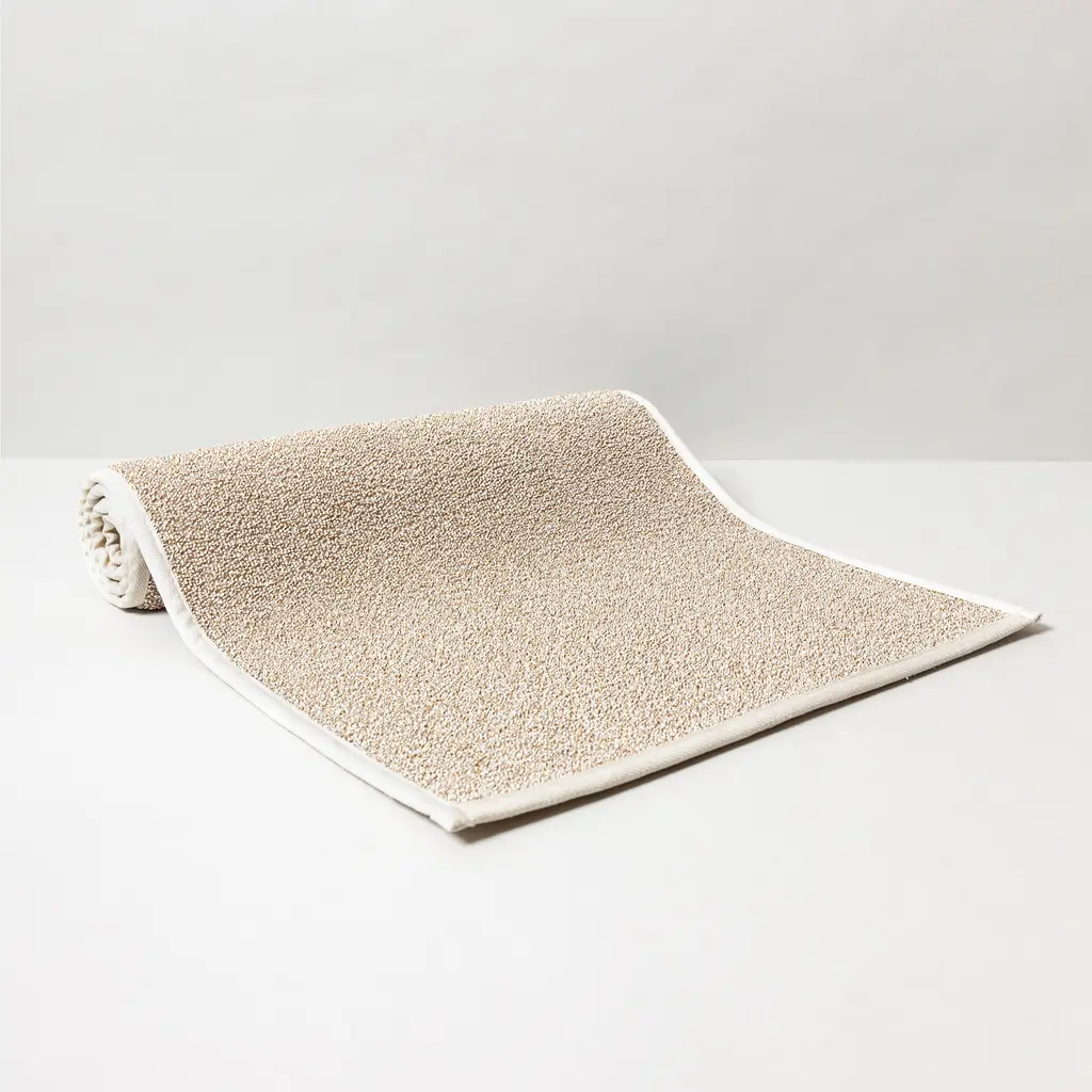 A minimalist, highly functional bath/kitchen mat made from Sasawashi fabric, known for its impressive absorbency and natural deodorizing properties. This mat quickly absorbs water, preventing dampness, while the embedded kumazasa fibers naturally fight odors and mildew. The textured, woven surface provides a gentle exfoliation, keeping feet fresh and preventing dust buildup, making it an ideal choice for a clean and modern bathroom aesthetic. An absorbent bath mat crafted with stiff, exfoliating, and naturally deodorizing Sasawashi fibers. This unique fabric combines high absorbency with gentle exfoliation and odor control, creating a refreshing post-bath experience.