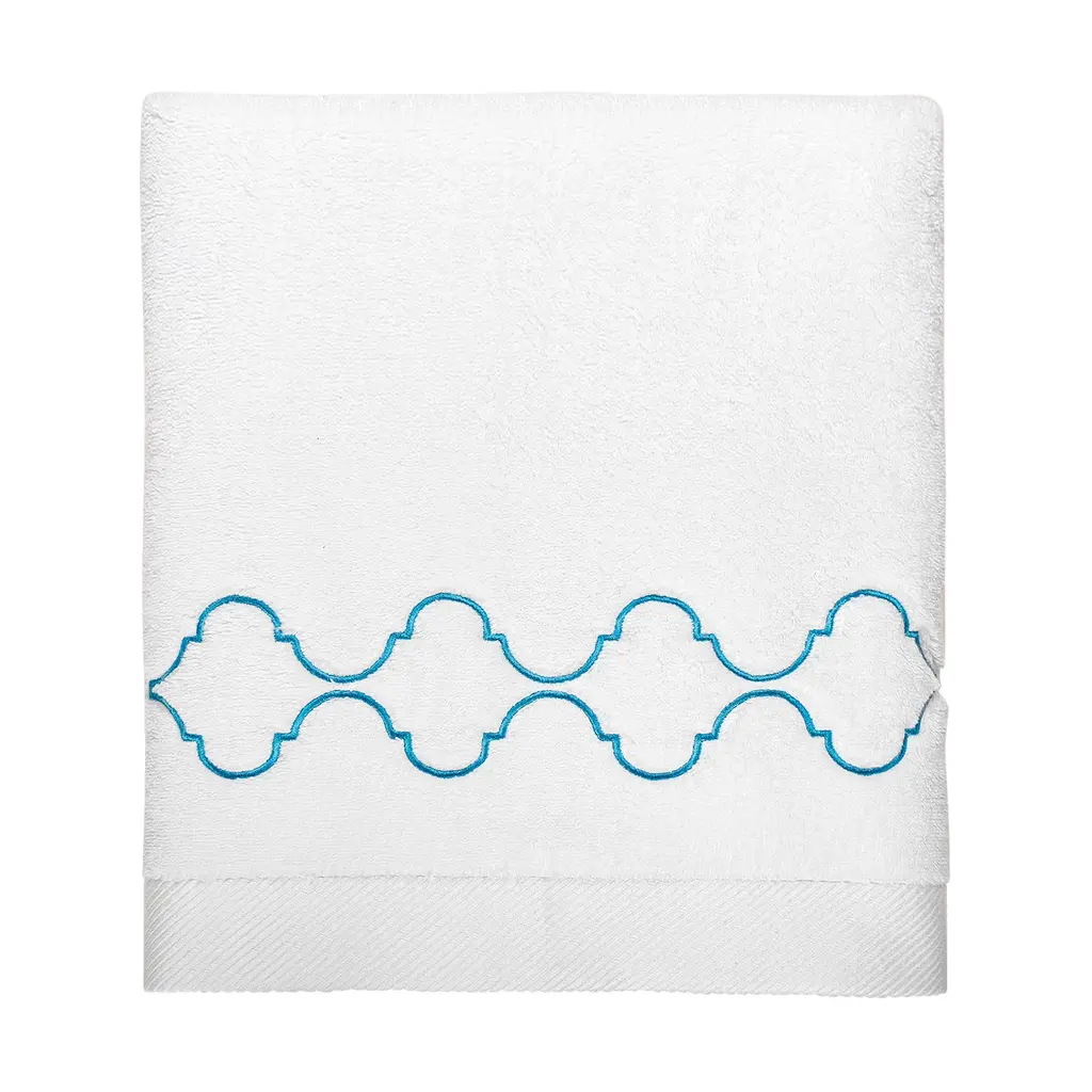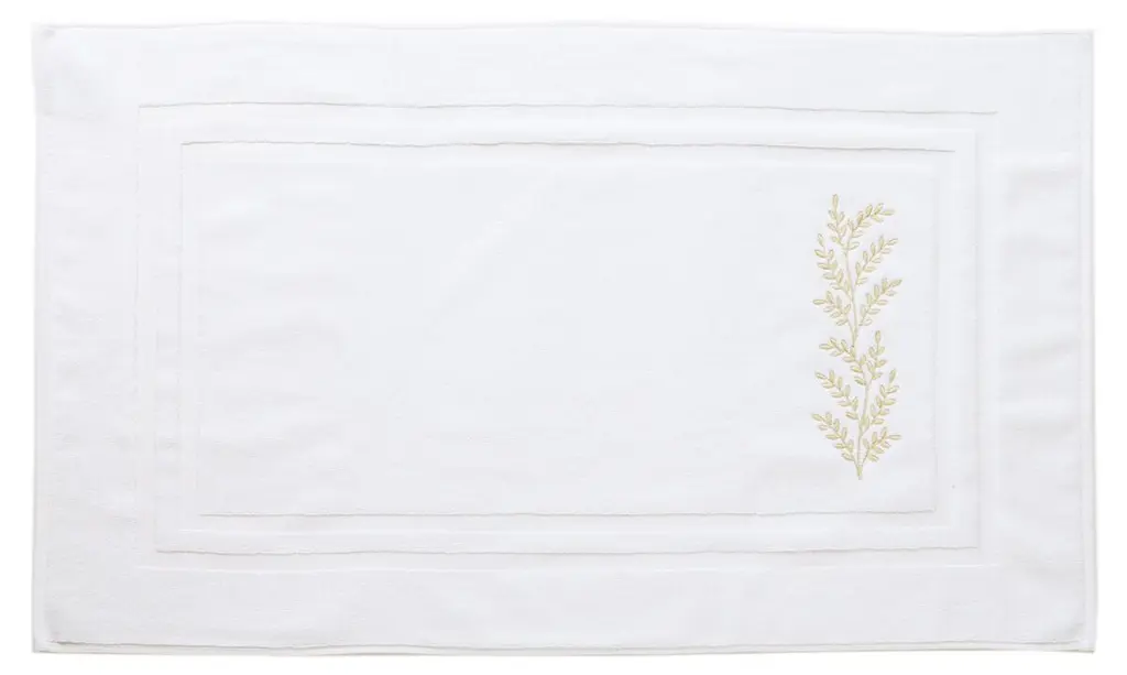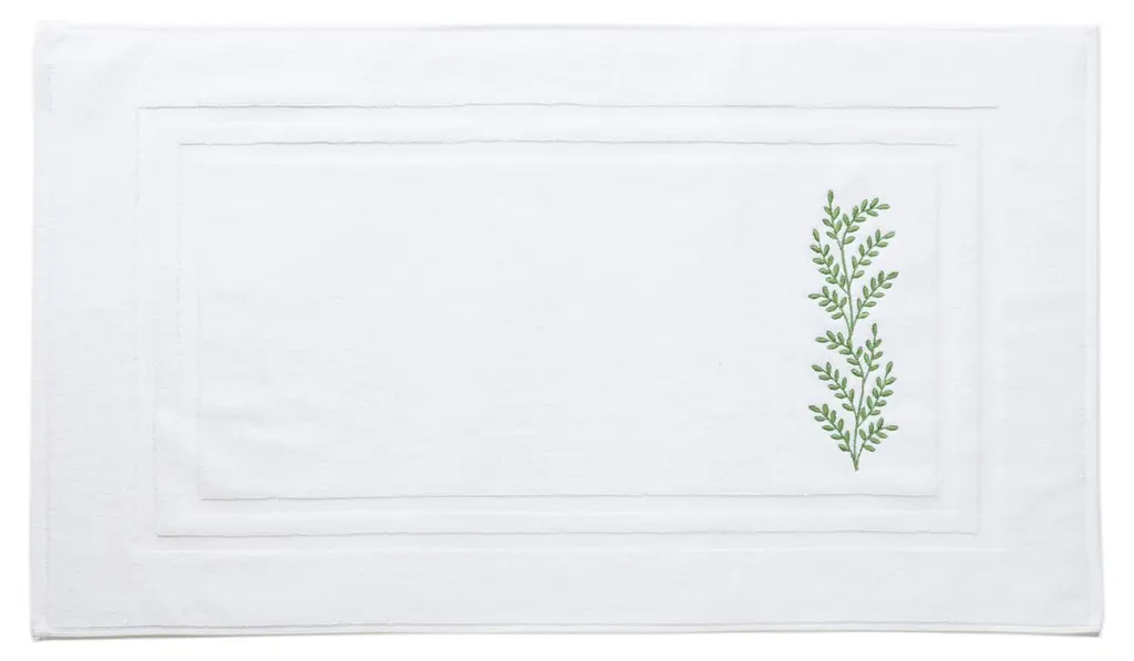 Powder blue flourishes add a fanciful finishing touch to this plush and absorbent bath mat, made from exquisitely soft combed cotton, woven in Italy and artfully embroidered in the USA.