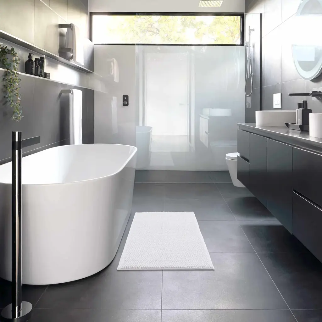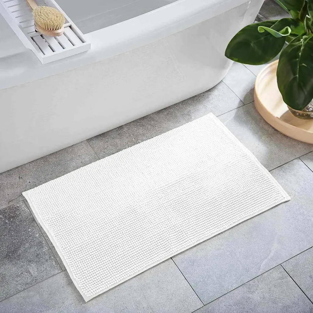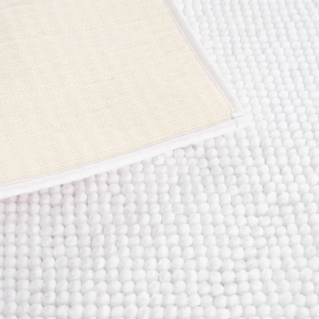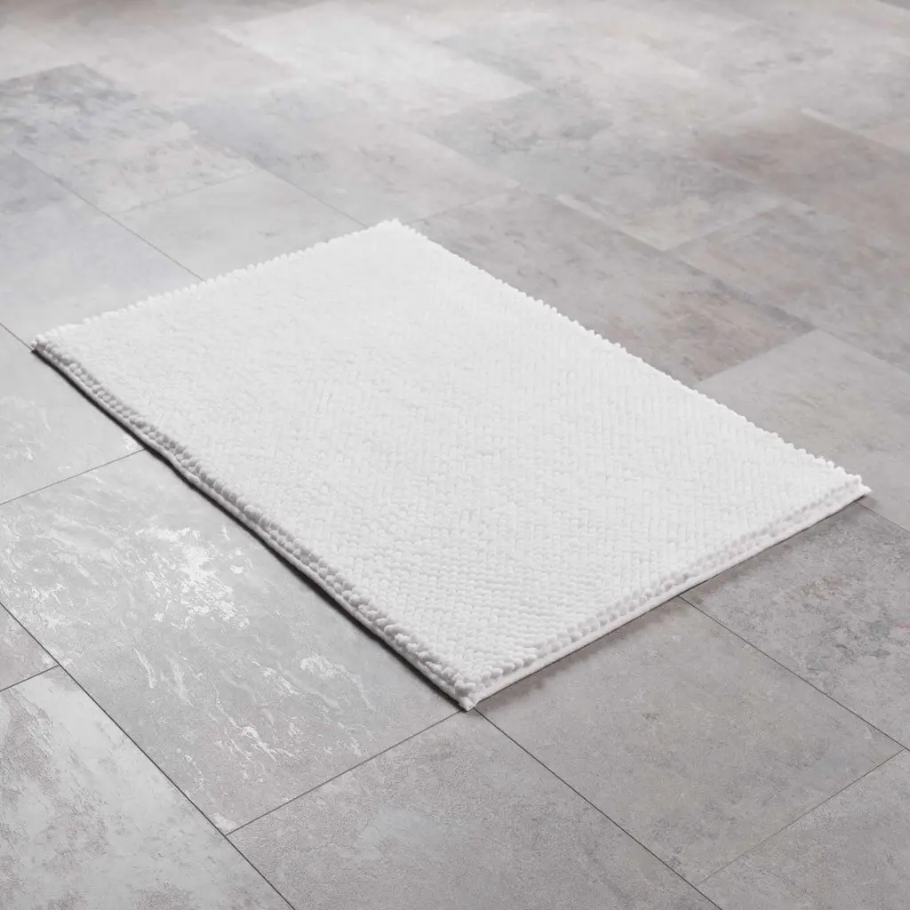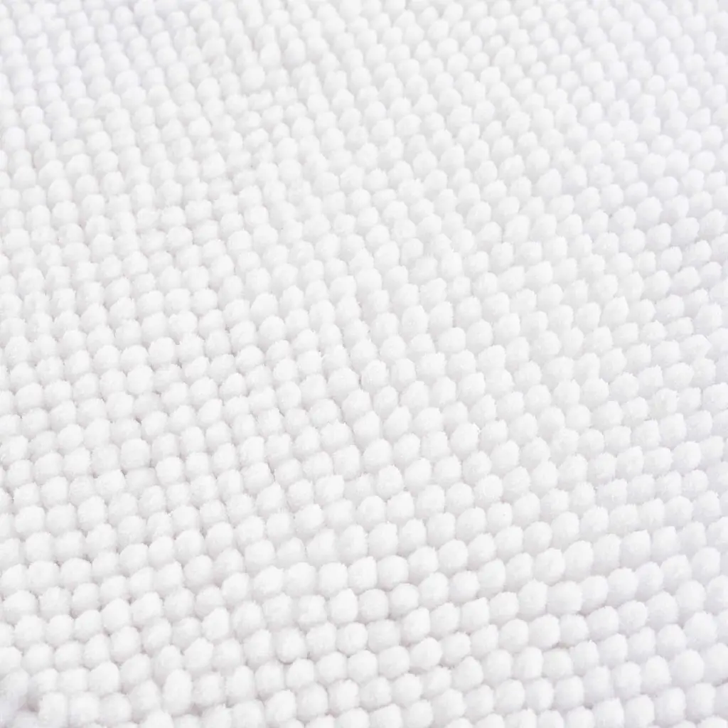 Enhance your bathroom's comfort and style with this white bath mat. Its plush, absorbent design is perfect for stepping out of the shower or bath. The mat's washable feature ensures easy cleaning and durability. Ideal for any bathroom, it offers a blend of luxury, practicality, and safety.