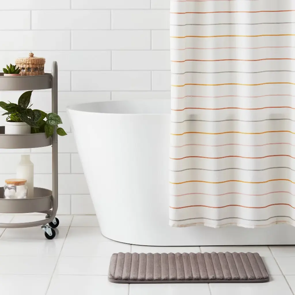 Elevate your bath space with comfort and style with this Ribbed Cushion Foam Bath Rug from Room Essentials™. The microfiber bath rug is designed in a rectangular shape with rounded corners and features a ribbed design for textural appeal. A warm, stylish accent you'll love adding to your bathroom floor, it also has non-skid backing to help keep it from slipping or sliding when you step on it. Place it in front of your bathtub, shower or sink for functional style.Room Essentials™: Everyday Value