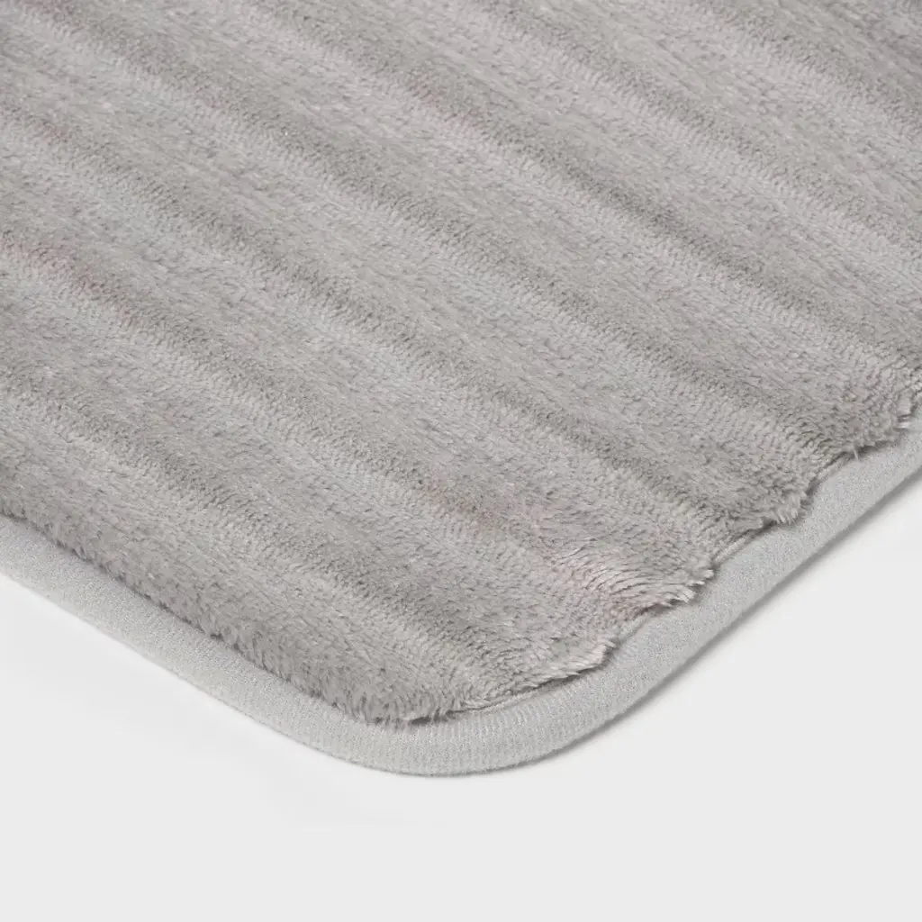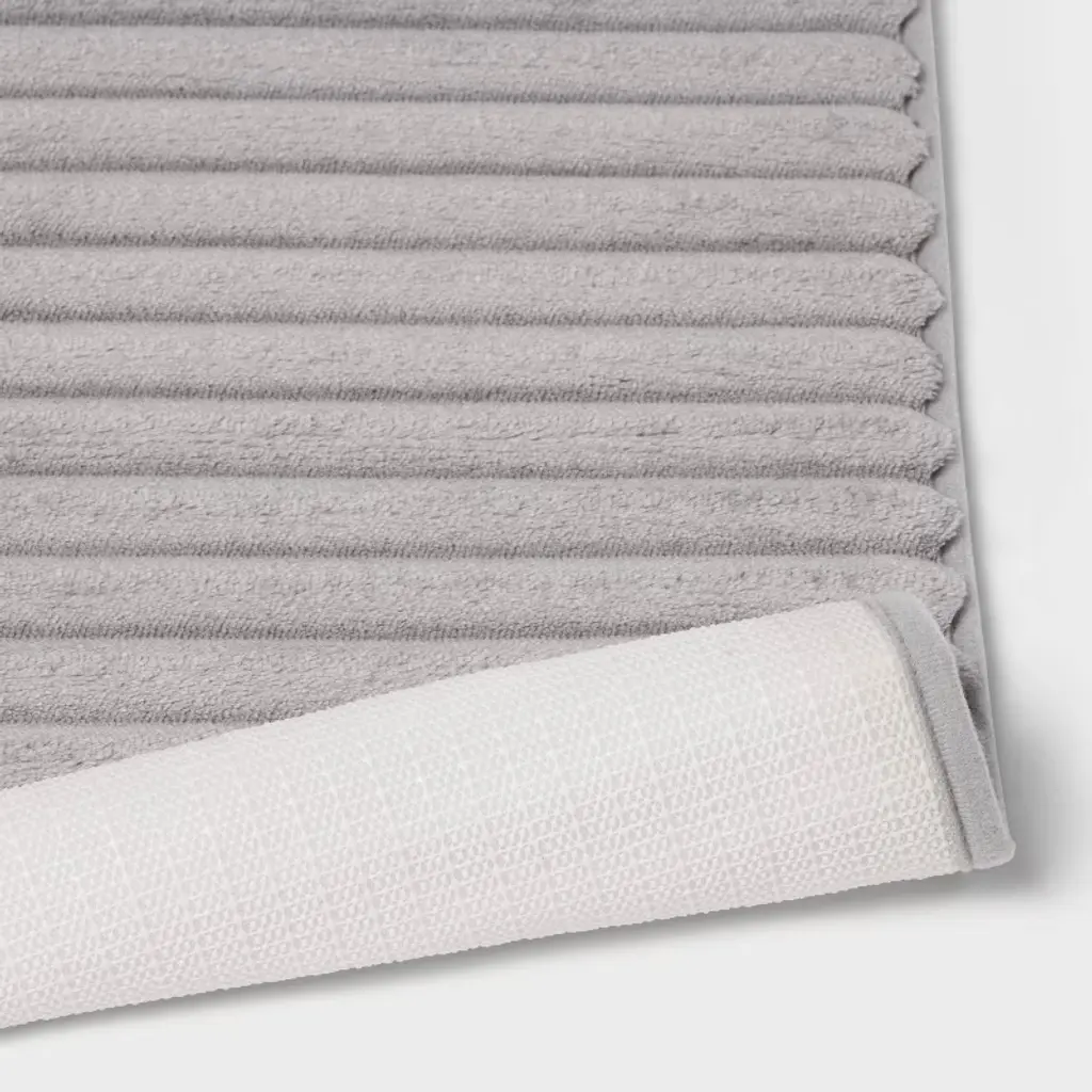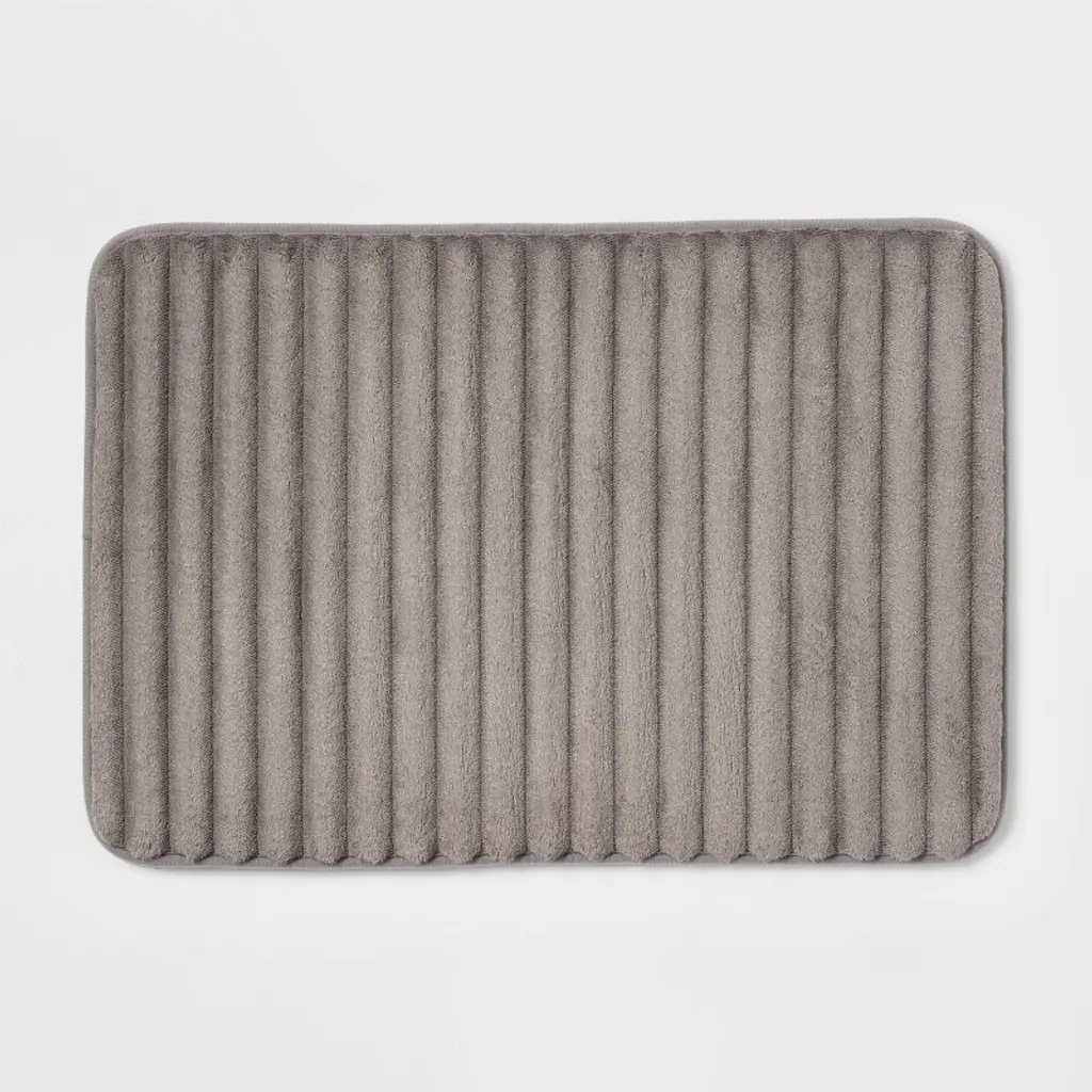 Elevate your bath space with comfort and style with this Ribbed Cushion Foam Bath Rug from Room Essentials™. The microfiber bath rug is designed in a rectangular shape with rounded corners and features a ribbed design for textural appeal. A warm, stylish accent you'll love adding to your bathroom floor, it also has non-skid backing to help keep it from slipping or sliding when you step on it. Place it in front of your bathtub, shower or sink for functional style.Room Essentials™: Everyday Value