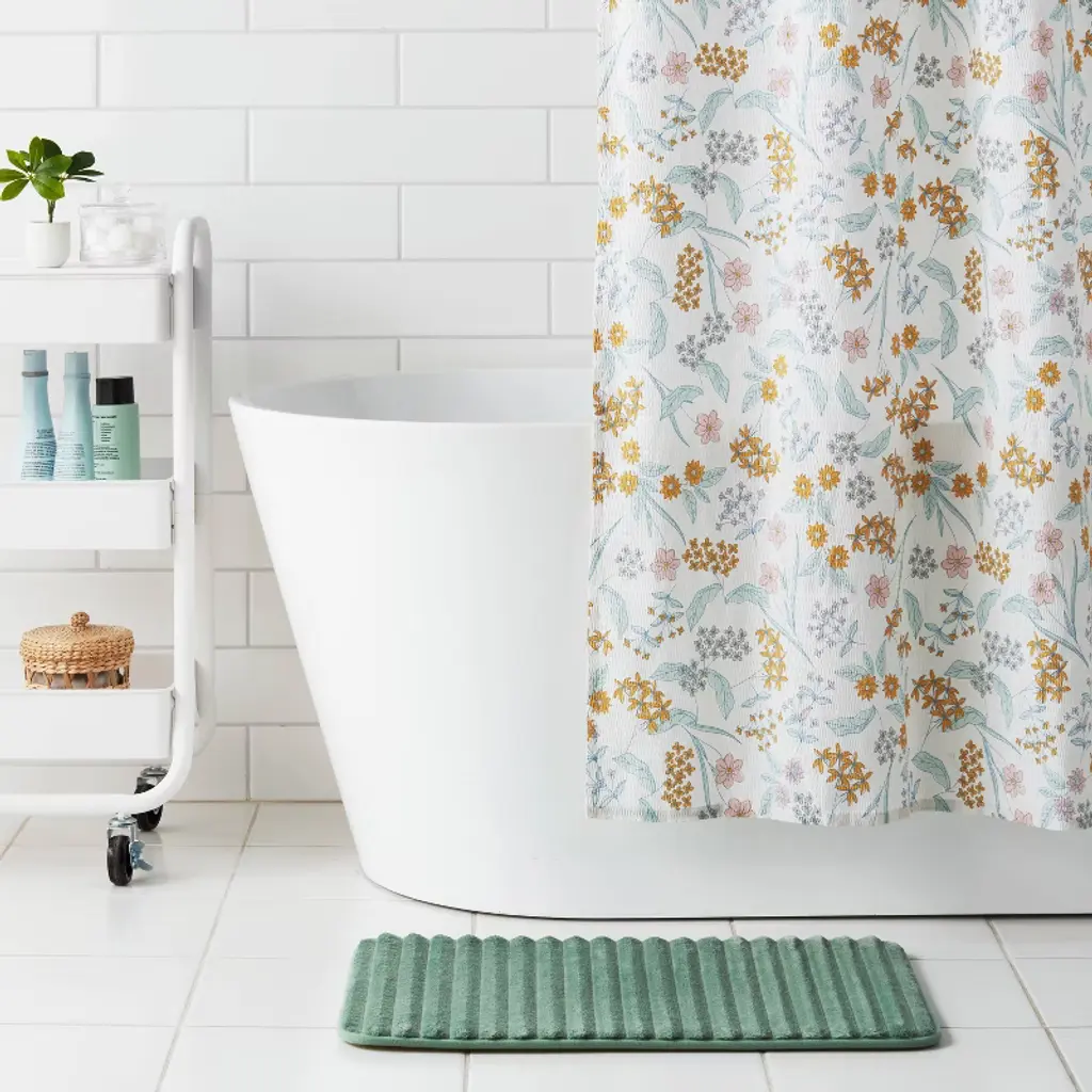 Elevate your bath space with comfort and style with this Ribbed Cushion Foam Bath Rug from Room Essentials™. The microfiber bath rug is designed in a rectangular shape with rounded corners and features a ribbed design for textural appeal. A warm, stylish accent you'll love adding to your bathroom floor, it also has non-skid backing to help keep it from slipping or sliding when you step on it. Place it in front of your bathtub, shower or sink for functional style.Room Essentials™: Everyday Value