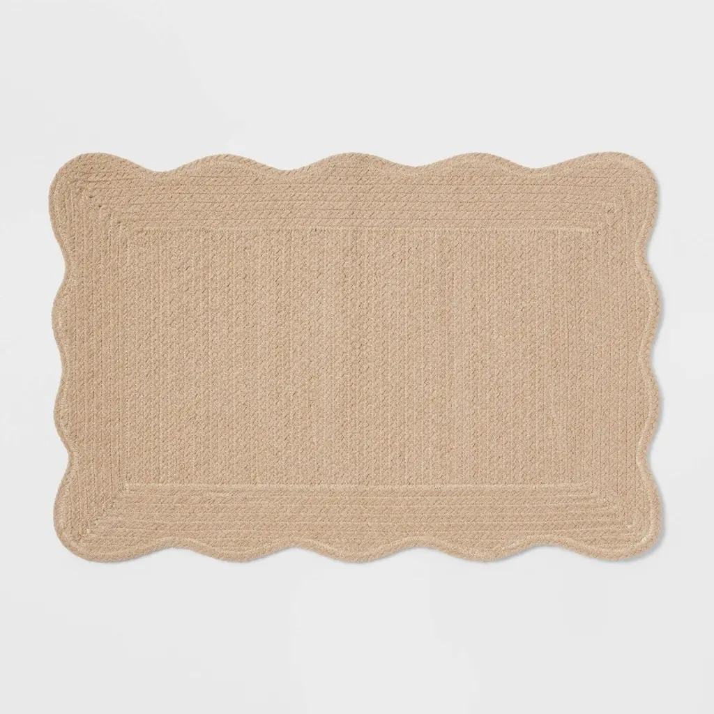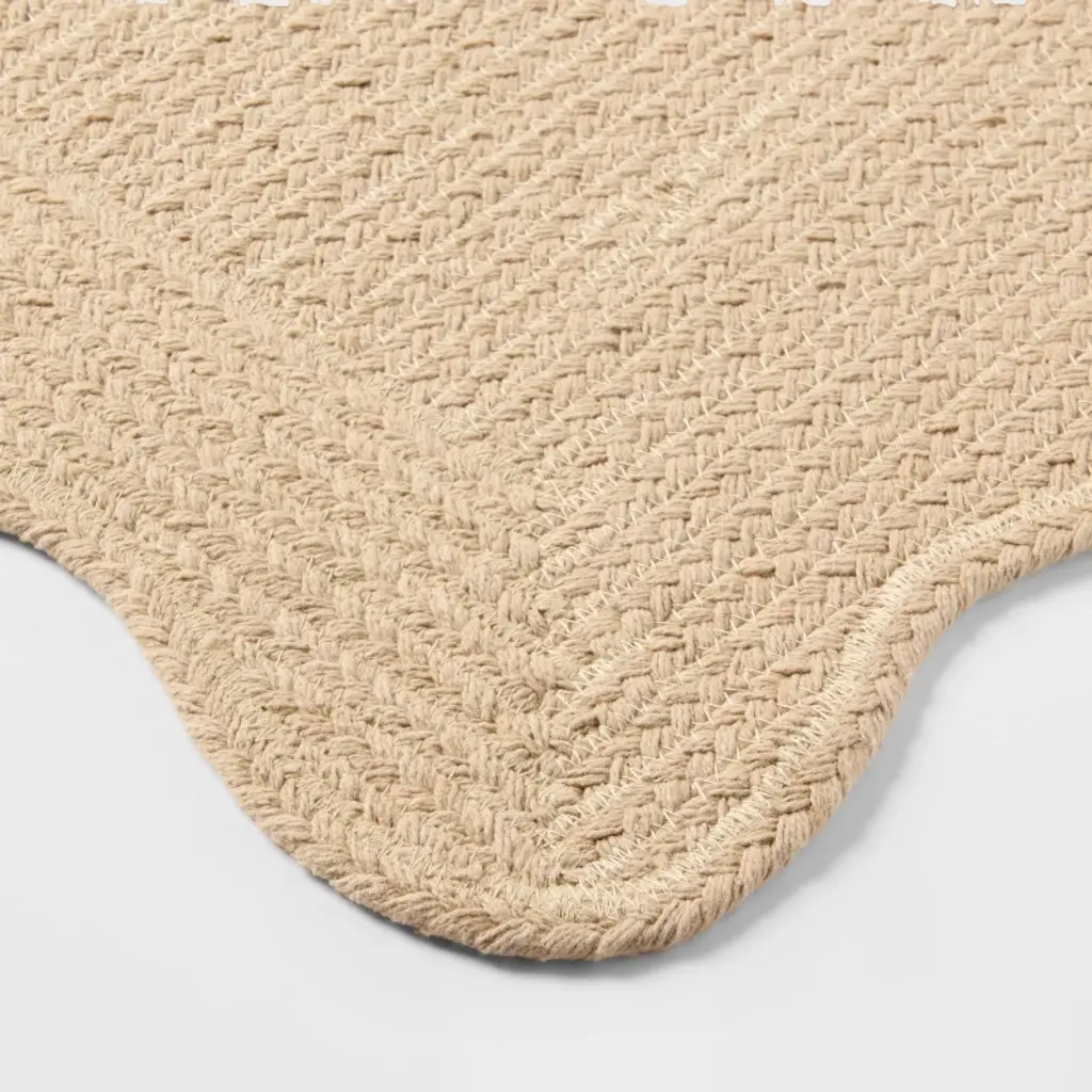 Add some nautical flair to your bathroom with this Coastal Scallop-Edge Bath Rug from Threshold™. The handmade bath rug showcases a braided design in a cream-beige hue with scalloped edges for a striking look. Made from 100% cotton with a flat pile height, the midweight rug offers a neat and elegant accent you'll love adding to your bathroom floor. Place it in front of your bathtub, shower or sink for functional style.Threshold™: Looks like home, feels like you.