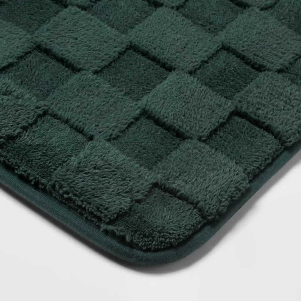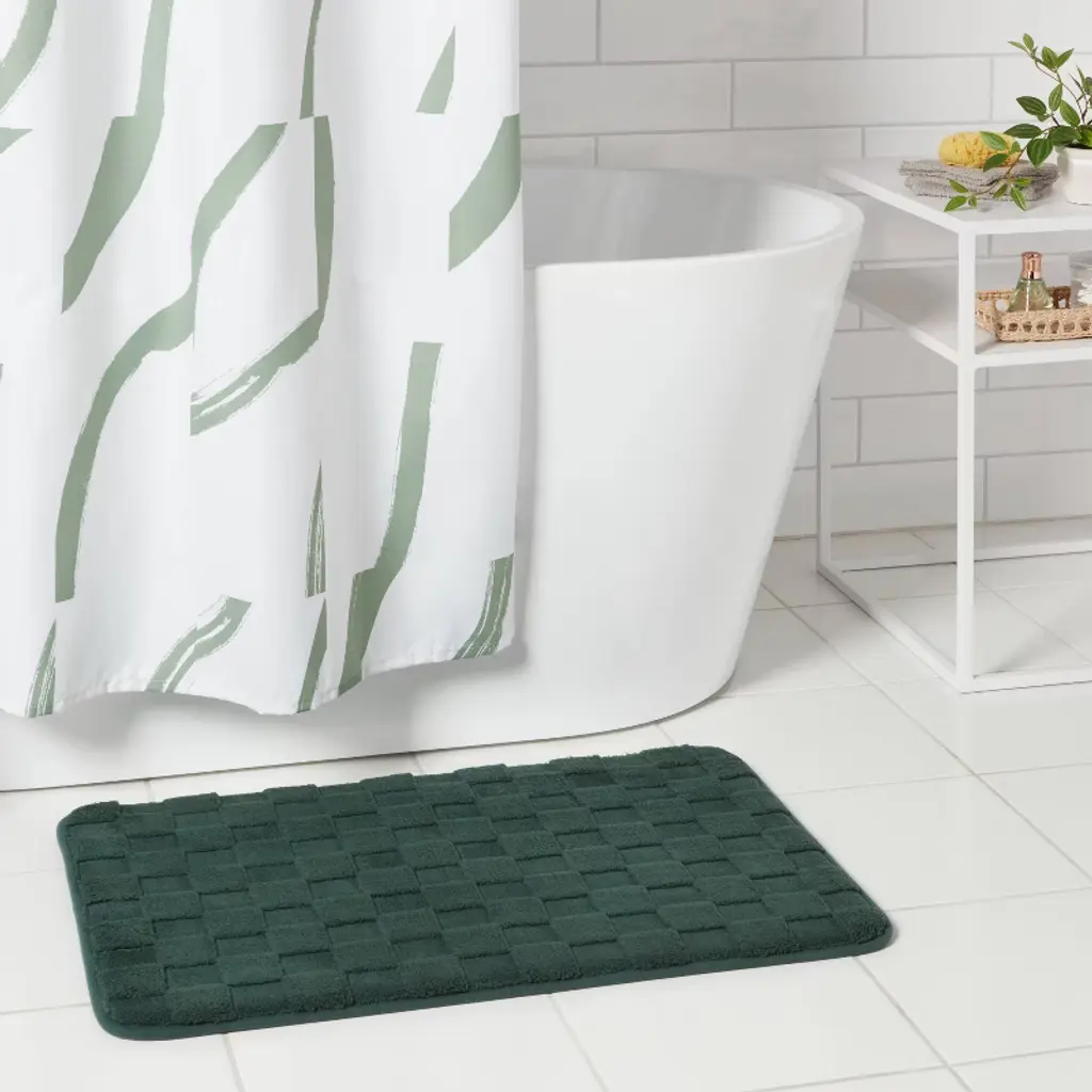 This Everyday Checked Cushion Bath Rug from Room Essentials™ gives your bath decor a spa-like touch. This dark green bathmat is crafted from microfiber fabric with a checked cushion texture to provide a comfortable surface underfoot as you step out of the bath or shower. Its non-skid backing helps keep it in place, and the machine-washable design allows for easy cleaning.Room Essentials™: Everyday Value