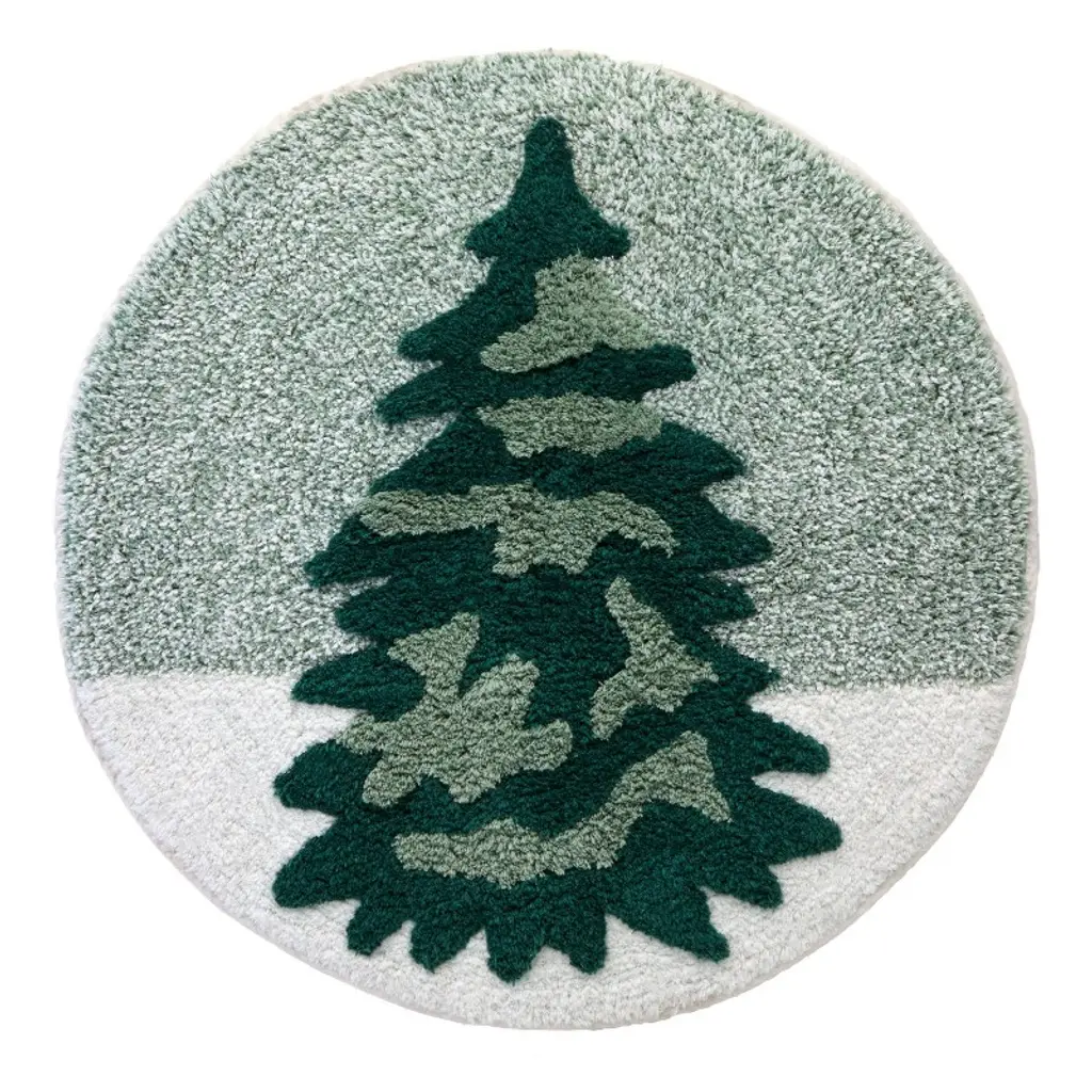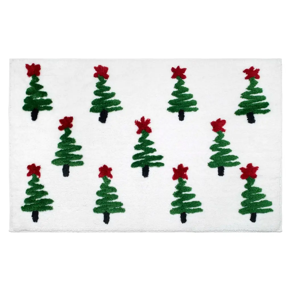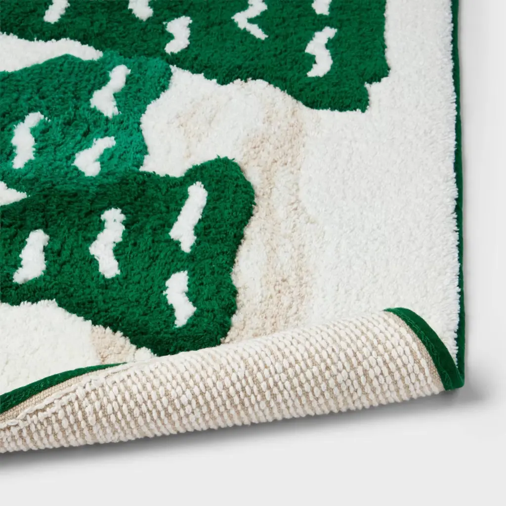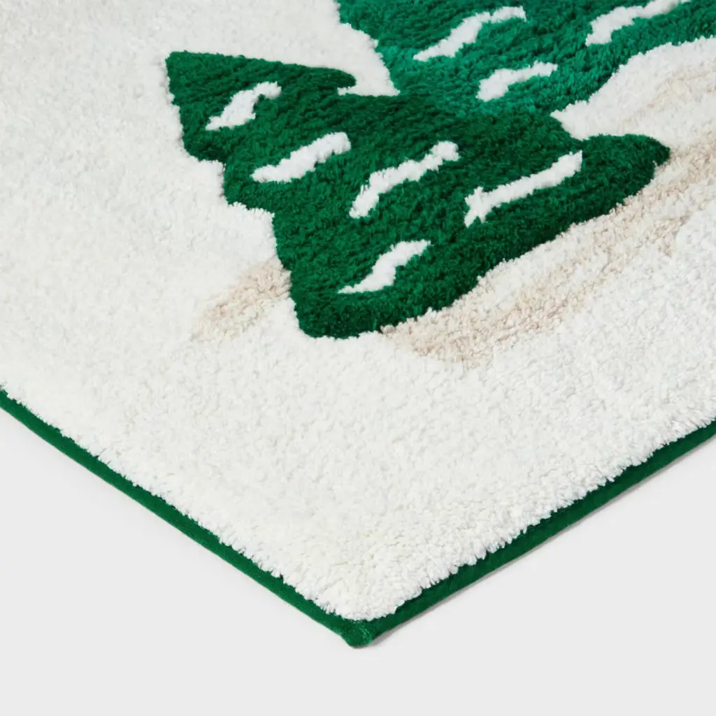 Spread holiday magic to your bath space with this Tree Christmas Bath Rug from Threshold™. The rectangular rug is adorned with three green Christmas trees on a cream-color backdrop for a festive look. Made of 100% cotton, the machine-washable rug with a low pile height boasts a tufted construction for enhanced underfoot comfort. Place it in front of your bathtub, shower, or sink for a fun and functional touch.Threshold™: Looks like home, feels like you.