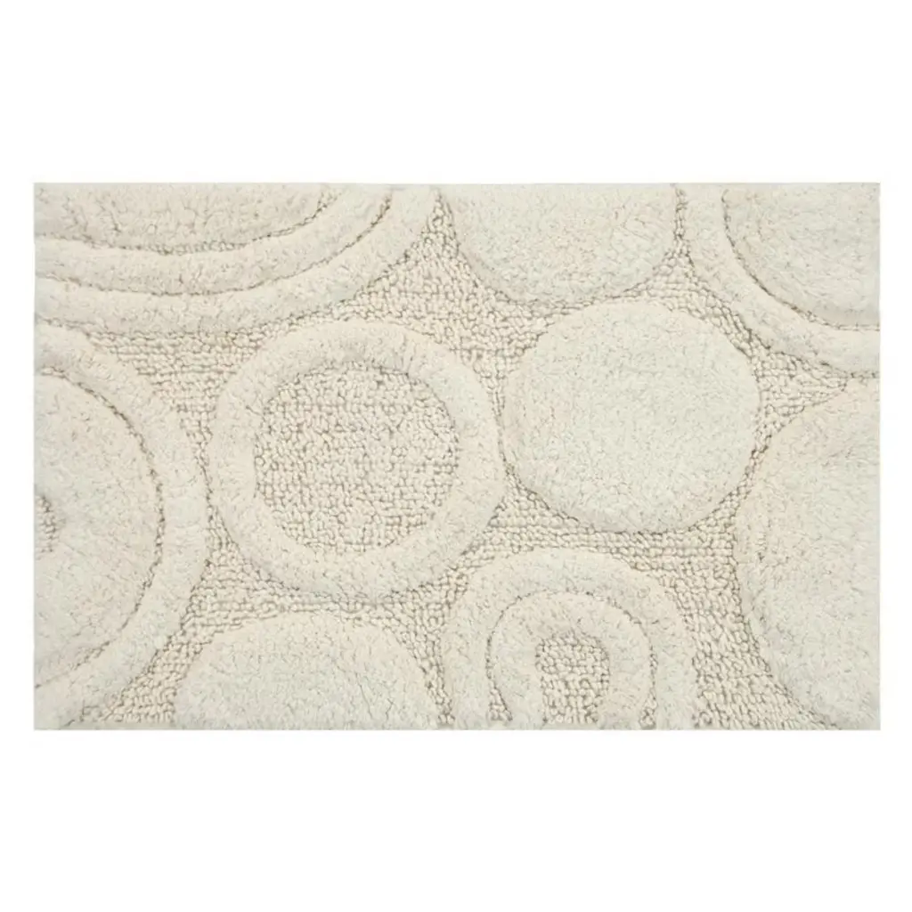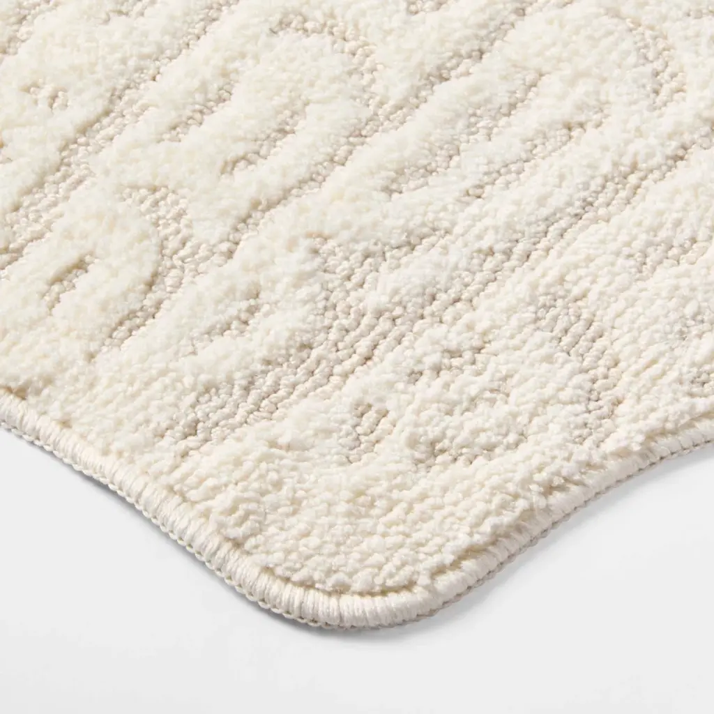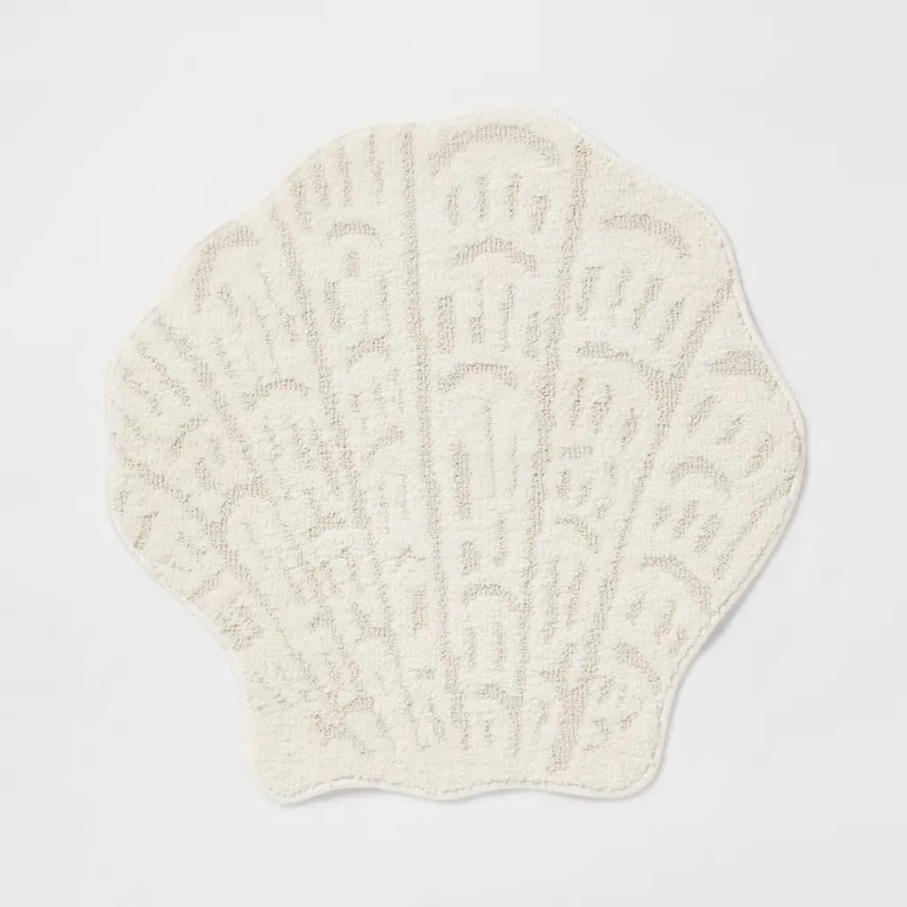 Infuse your bathroom decor with the ocean-inspired charm of this Seashell-Shaped Coastal Non-Skid Bath Rug from Threshold™. This midweight bath rug is designed in a seashell shape with knitted cream surface and tonal detailing for a striking look. A warm, stylish accent you'll love adding to your bathroom floor, it also has non-skid latex backing to help keep it from slipping or sliding when you step on it. Place it in front of your bathtub, shower or sink for functional style.Threshold™: Looks like home, feels like you.