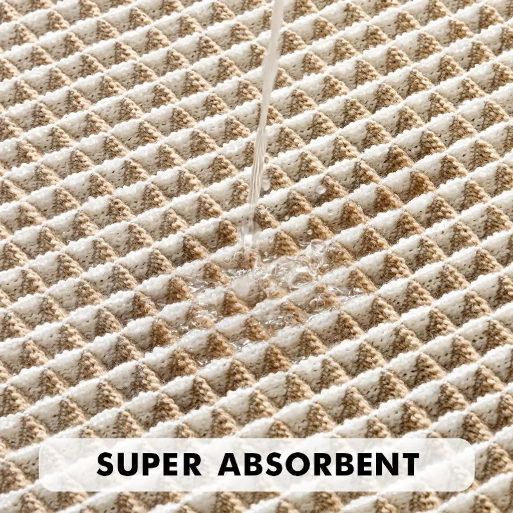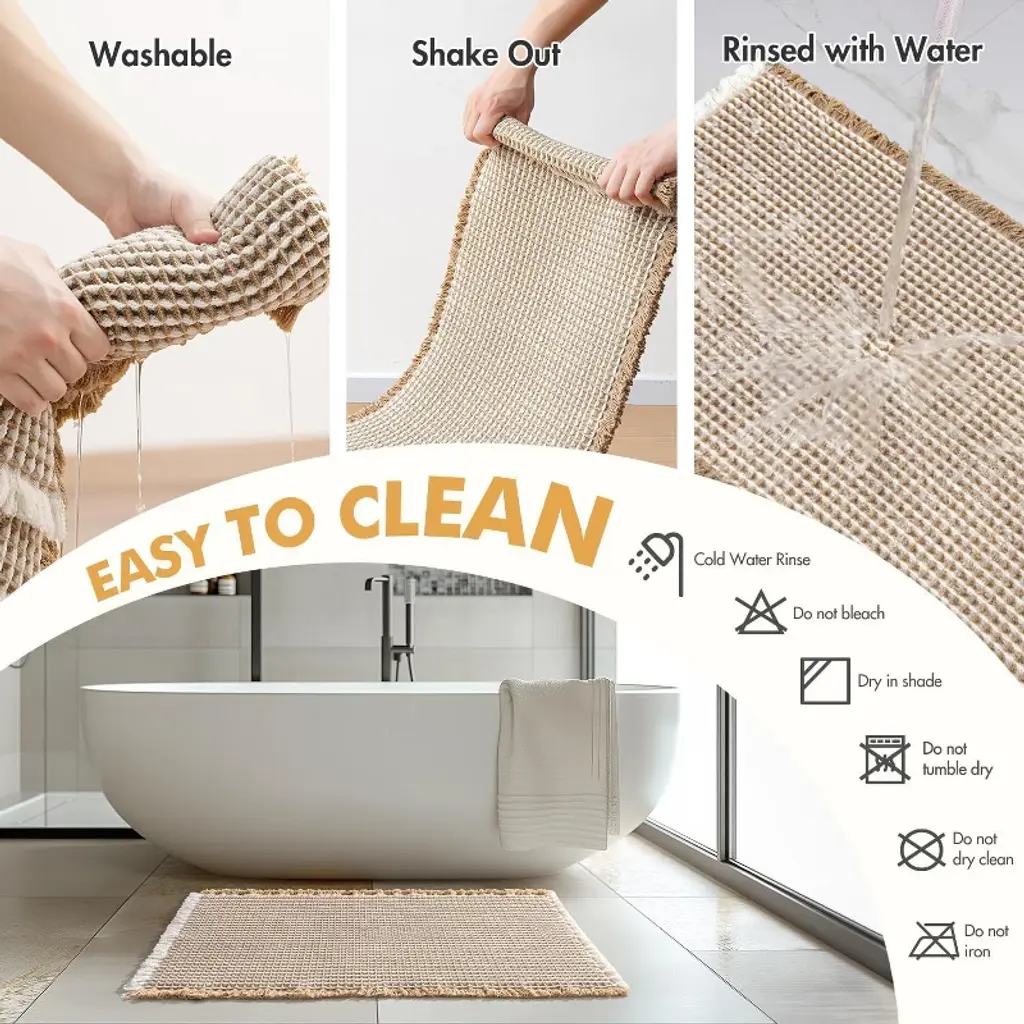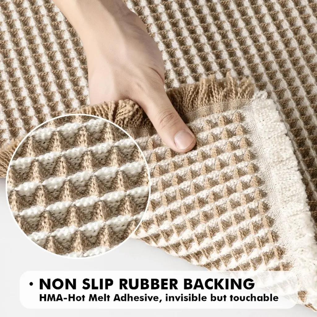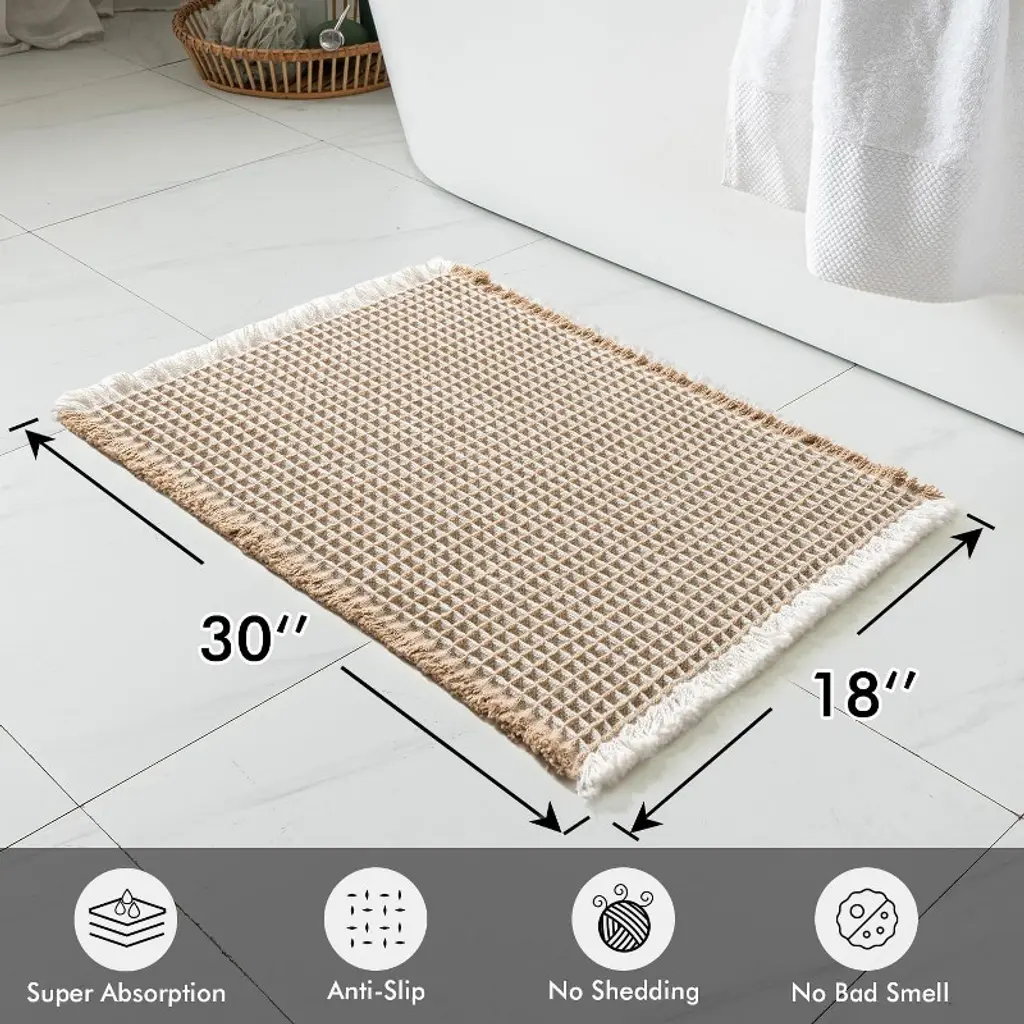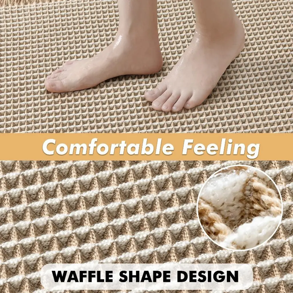 Happiness in the bathroom often lies in a good bath mat. This set of brown & white waffle bath mats fills post-shower convenience and comfort with thick texture and thoughtful design—measuring 18×30 inches, it perfectly covers the area outside the shower or bathtub. No more stepping on cold tiles when you step out; it also quickly soaks up water, keeping the bathroom dry and tidy at all times. Its waffle design is more than just aesthetic: upgraded thickened yarns are woven into tighter patterns, so it won’t deform or loosen after a few uses. It’s more durable than ordinary bath mats and maintains its shape even with long-term stepping. The brown & white color scheme has a bohemian relaxed vibe; placed in the bathroom, it’s not as dull as traditional mats, but instead becomes a small decorative piece that adds a sense of ritual to daily washing. Its water absorption is even more impressive: the double-layer waffle texture acts like a "sponge," instantly absorbing water droplets from your feet. It won’t feel damp or sticky when you step on it, and also prevents water stains from causing slippery floors. What’s more thoughtful is its non-slip design—it has an invisible hot-melt adhesive rubber backing that feels substantial to the touch. It adheres firmly to tiles or smooth floors, even when wet, so you can rest easy with the elderly or children at home. The foot feel is exceptionally comfortable: the 3D waffle’s fluffy texture paired with soft yarns feels like stepping on a cloud—no hard, uncomfortable edges. Standing on it to dry your feet after a bath eases tiredness a little. Daily maintenance is also hassle-free: simply shake off dust with your hands for basic cleaning; if it gets dirty, hand wash it or rinse it under running water. It retains its shape after drying, no need to worry about deformation or failure of the non-slip layer from machine washing. The set of two is particularly practical—you can place one by the shower and one by the sink, or one in the master bathroom and one in the guest bathroom, balancing functionality and appearance. From material to details, it perfectly balances "usefulness" and "good looks," making the bath mat no longer just a functional item, but a small detail that enhances the comfort of your home.
