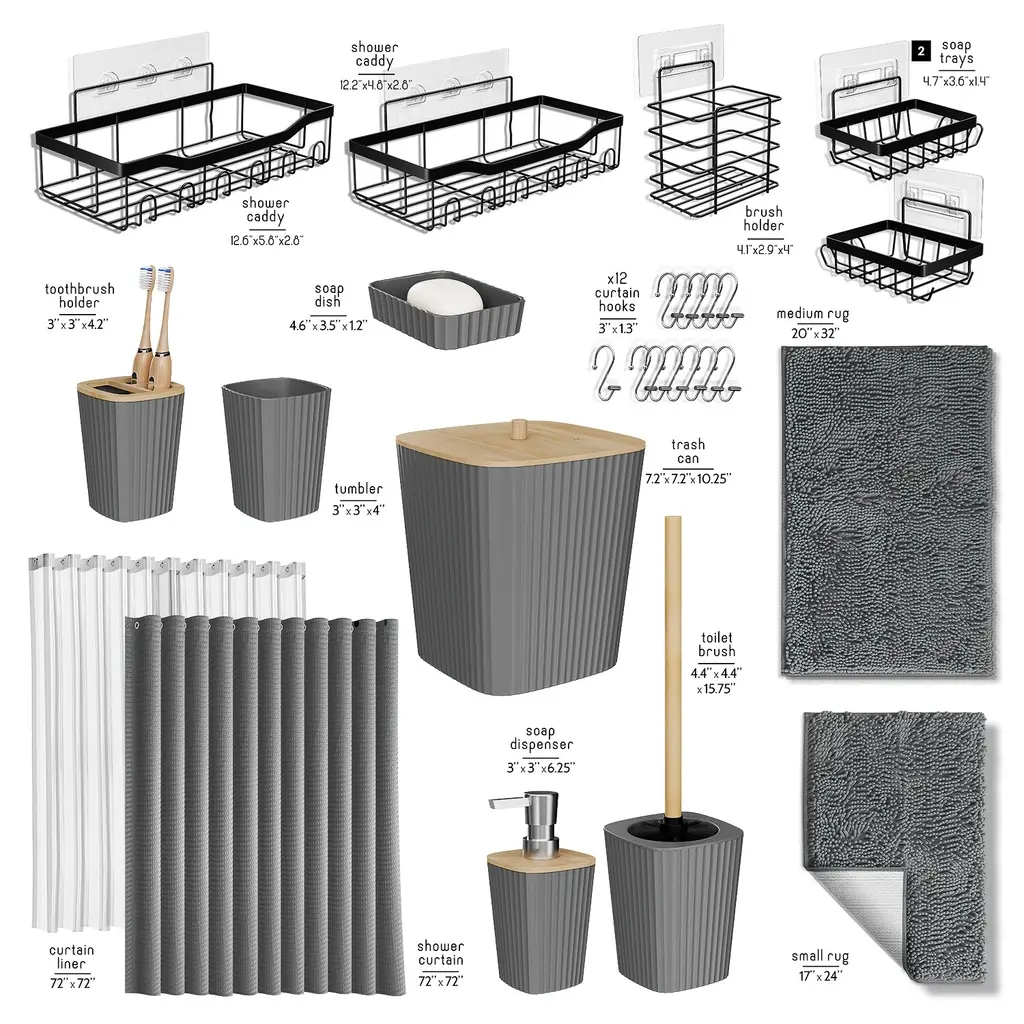 Bathroom Accessories Set With Shower Caddy And Bath Rugs - Grey - Complete 27-Piece Set