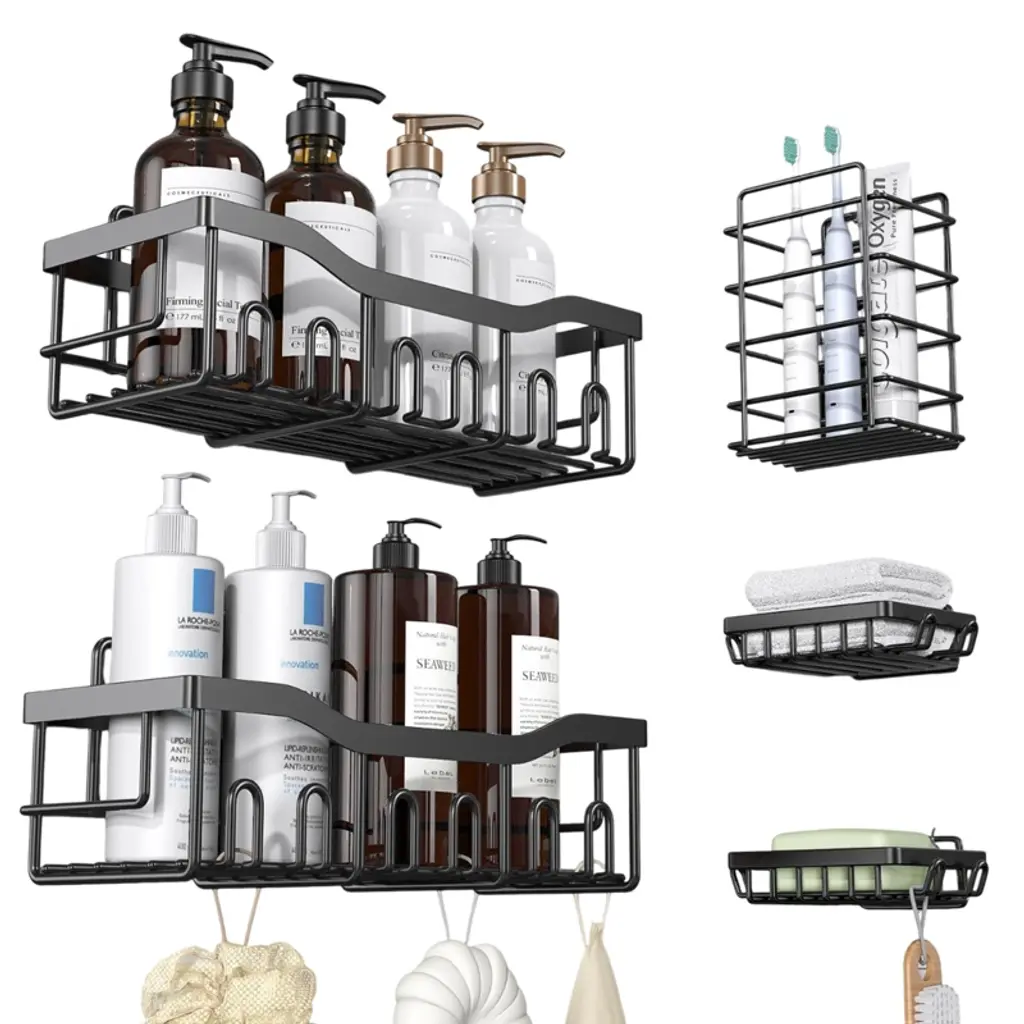 **Elevate Your Bathroom with Our Bathroom Accessories Set:** Add a touch of sophistication to your bathroom decor with this comprehensive 27-piece set, featuring bamboo accents and sleek black finishes. The set includes a 5-piece shower caddy set, two plush chenille bathroom rugs (20"x32" and 17"x24"), toothbrush holder, tumbler, soap dispenser, soap dish, bathroom trash can, toilet brush and holder, and a fabric shower curtain with a clear liner and 12 rust-resistant hooks. The boho black shower curtain, measuring 72" x 72", is crafted from durable, wrinkle-resistant polyester with a waffle texture, and features weighted magnets for a secure fit. The rustproof stainless steel shower caddy set provides efficient in-shower storage, with heavy-duty adhesive shelves that easily install on smooth surfaces without drilling, offering a reliable and stylish solution for organizing your bathroom essentials.