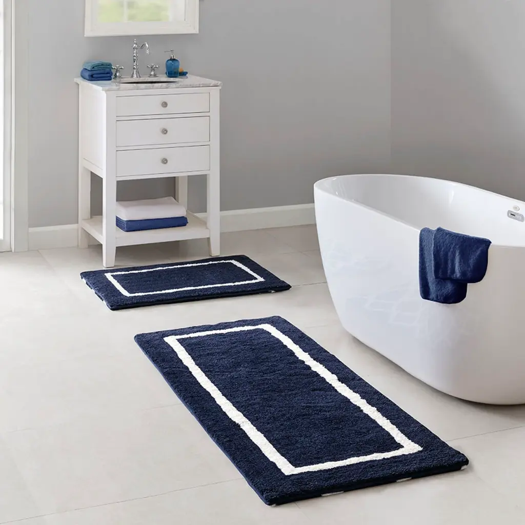 The Madison Park Bittman Reversible High Pile Tufted Bath Rug offers a modern update to your bathroom. Fully reversible, this high pile bath rug features a geometric fretwork design that flips to a classic border pattern, on the reverse, for two soft contemporary looks. This bath rug is also OEKO-TEX certified, meaning it does not contain any harmful substances to ensure quality comfort and wellness. Easy to coordinate with your bathroom décor, this reversible tufted bath rug comes in two sizes with several color options and is machine washable for easy care. A rug pad is recommended to keep the bath rug secured in place.