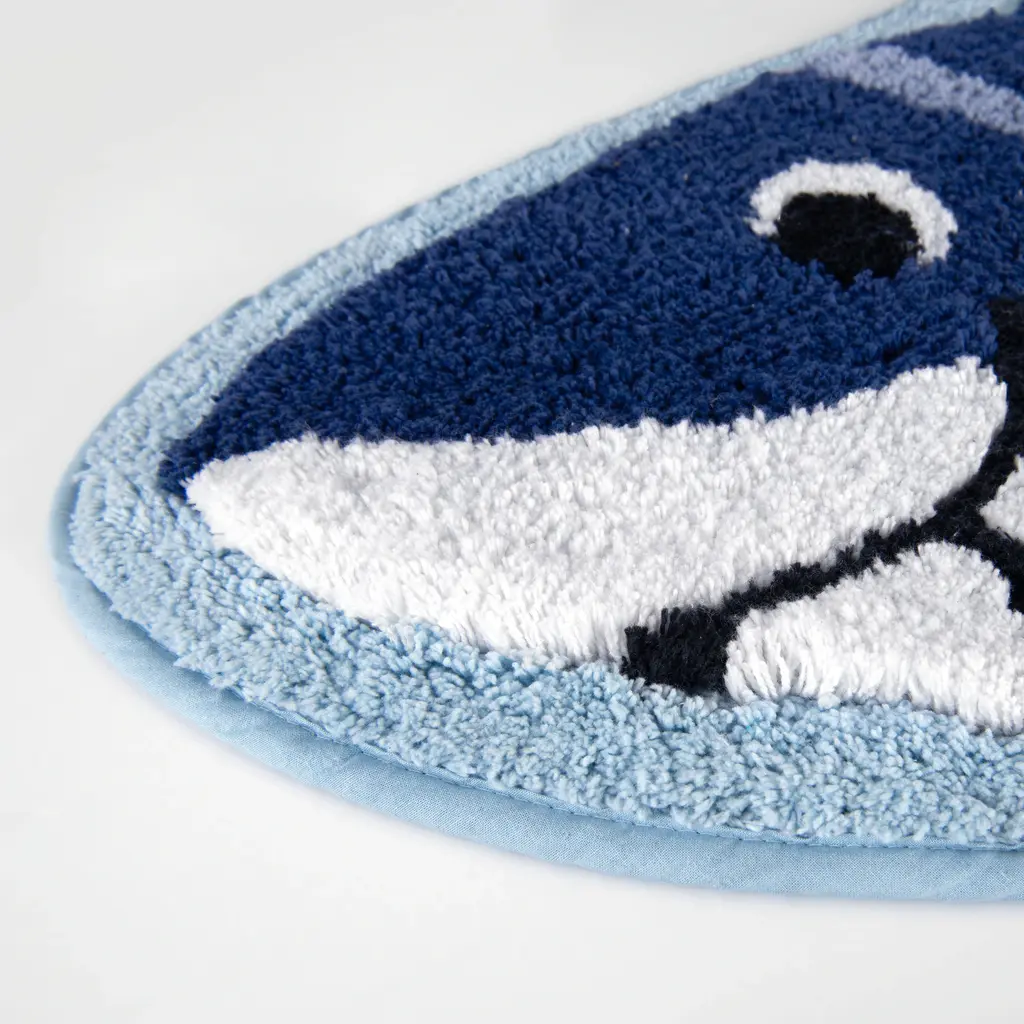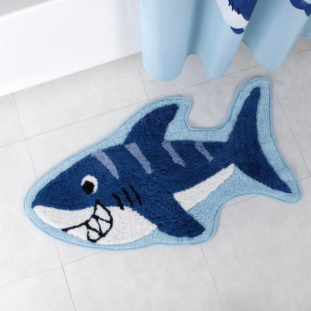 Spark your kid's imagination as they dive into a fun, filled adventure with the Colorful AnimatedSharks Bath Rug by Allure Home Creation. This whimsical shaped tufted rug, made of 100% cotton with a skid resistant latex backing, features a large, smiling animated shark in eye-popping bright blues with white. It measures 20" x 38" and will give you a comfy, soft spot to stand while keeping your floor clean and dry. Splish, splash, and big smiles guaranteed! Hand Wash, Spot or Wipe Clean. Machine wash cold and tumble dry on low heat. Complete the look by coordinating with other pieces in the Bath Collection or use alone.