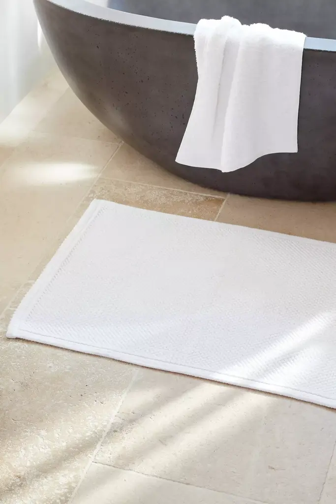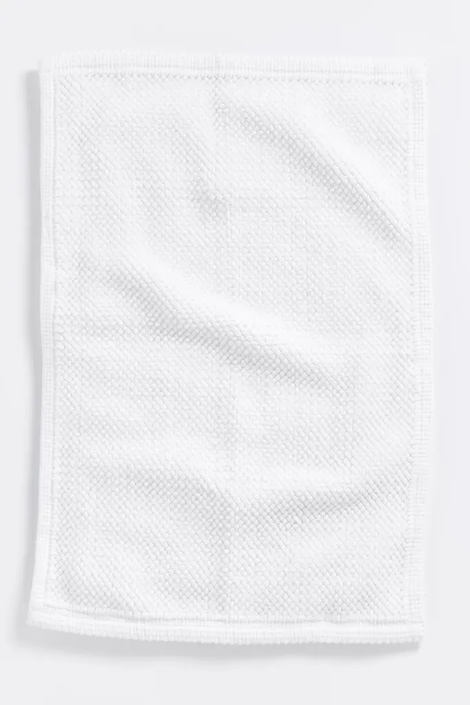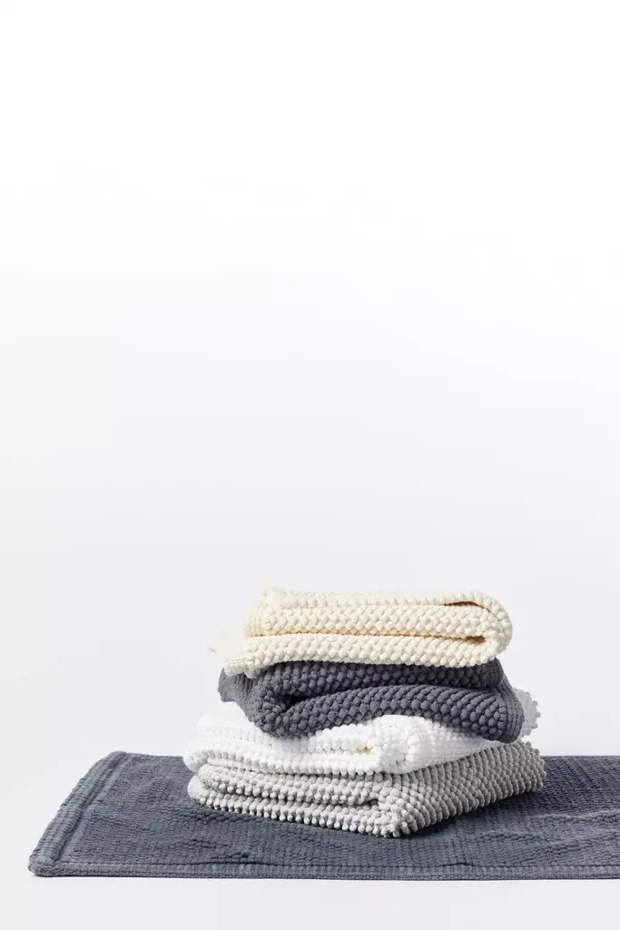 A pebbled weave creates the soft, nubby texture of this absorbent organic cotton rug. Mid-to-heavy weight mat feels soft and substantial underfoot, with a 1" border and a notched, nobby texture grooved hem along the ends.Coyuchi produces high-quality linens from minimally processed natural and organic fibers in responsible and ethical factories. With a relaxed palette inspired by the coast, Coyuchi products are crafted without compromise to design, comfort or the planet. * 100% Organic Cotton* Machine washable. Wash on delicate cycle with like colors, cold water and a plant based detergent. Whiteners not recommended. Only use non-chlorine bleach. Line dry or tumble dry low. * Imported#### *Dimensions* 24" x 36"