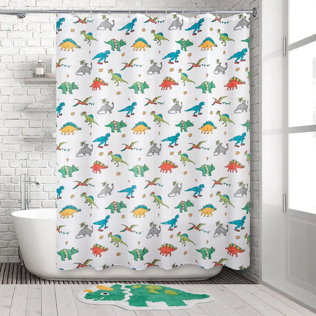 Transform your child's bathroom into a prehistoric playground with the Dinosaur Bath Rug by Allure Home Creation. This tufted bath rug, made of 100% cotton with a skid resistant latex backing, features a personable brightly colored shaped dinosaur on a white backdrop. It measures 21" x 34" and will give your little one a comfy, soft spot to stand while keeping your floor clean and dry. This delightful dino-mite buddy is sure to bring fun and adventure to your dinosaur enthusiast's bathroom. Machine wash cold and tumble dry on low heat. Use alone or coordinate with the Dinosaur Shower Curtain and other matching Bath Accessories.