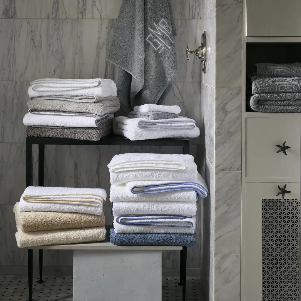 Soft, plush and absorbent cotton terry with a contrasting color piped trim.