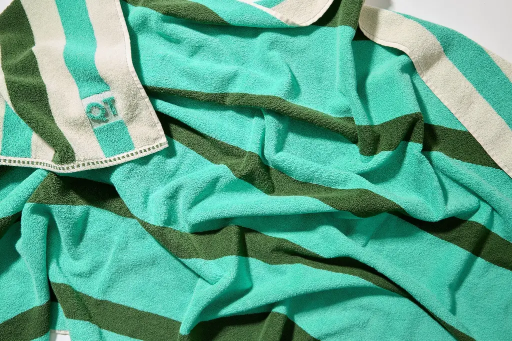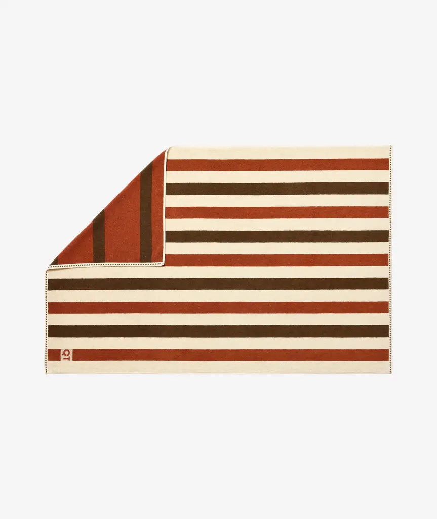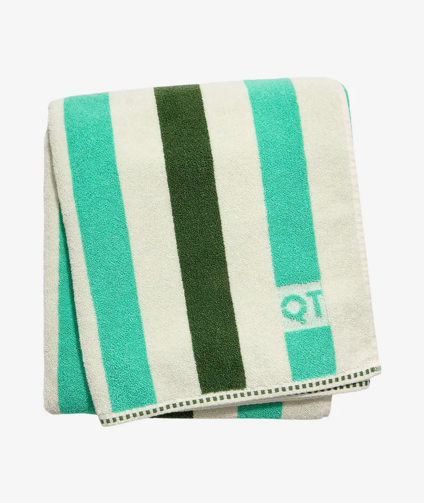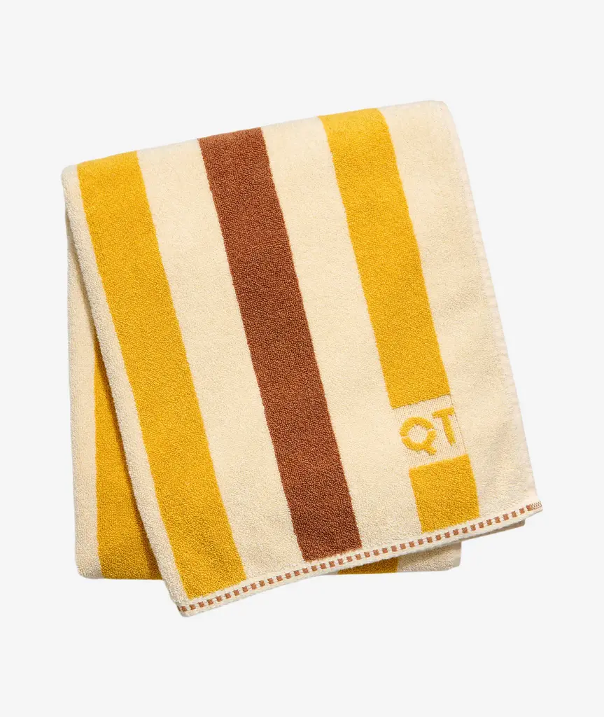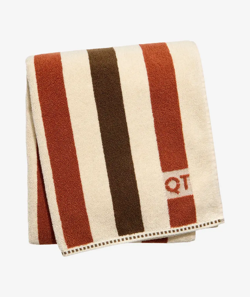 Introducing the Catalina towel collection! Double-sided stripes with a cream stripe running through one side and color-to-color on the other. Made from 100% GOTS certified organic cotton in Portugal, the Catalina is a generous 40”x60” bath sheet. Designed to be styled on its own or mixed with our Tam check towels for easy pattern play. Trimmed in tiny checks and finished with a small, sculpted QT and our hanging loop for ease.