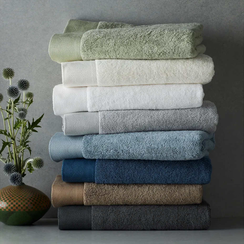 Luxuriously soft and absorbent, these Egyptian cotton bath towels by Frette feature a diamond-patterned jacquard border.