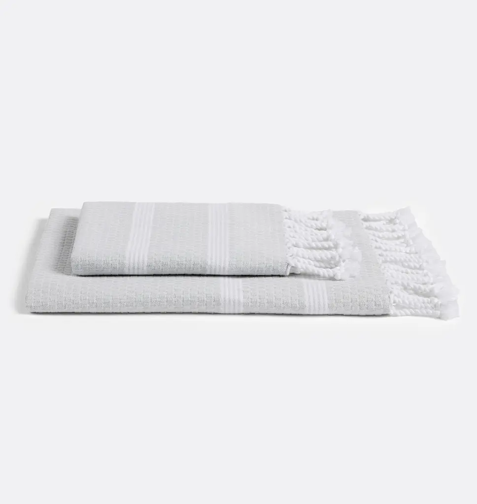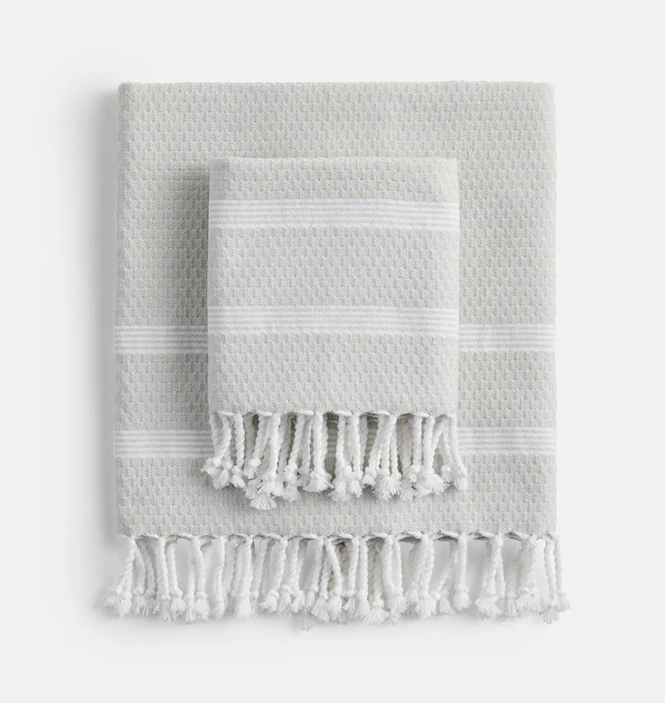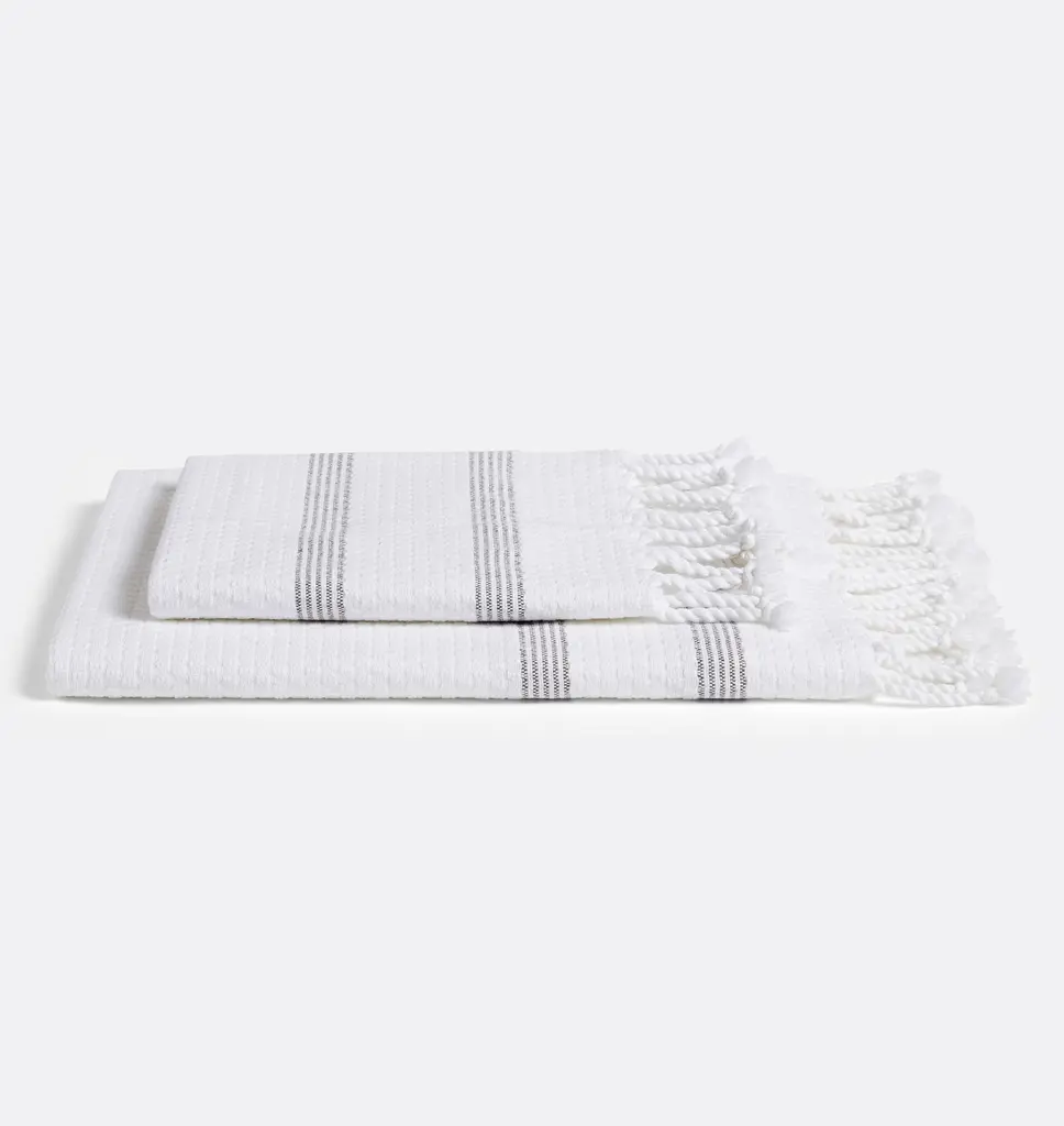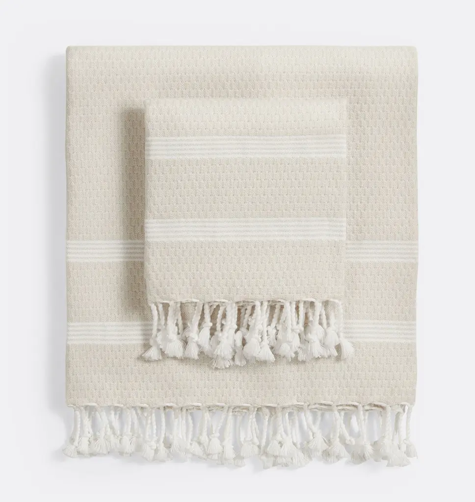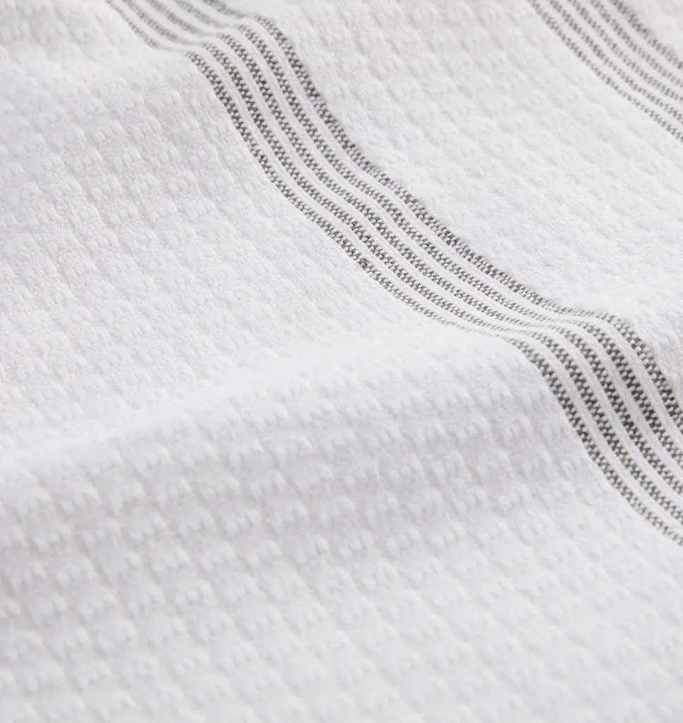 Made from 100% organic Turkish terry cotton, our Pebbled Organic Turkish Towels feature a plush, absorbent weave for a comfortable and luxurious feel. The combination of elegant neutral colors, tasteful stripe design, and rope tassel detail add a beautiful, eye-catching texture to elevate any bathroom or powder room. Details You'll Appreciate Available in three neutral colorways Natural rope tassel detail STANDARD 100 by OEKO-TEX® Certified: tested against a list of 400+ harmful substances to keep you and your family safe. 14.HUS.42449 HOHENSTEIN HTTI Global Organic Textile Standard (GOTS) Certified: Organic cotton is grown without harmful chemicals or pesticides, contributing to cleaner soil and waterways. Product Specifications 100% organic cotton Made in Turkey