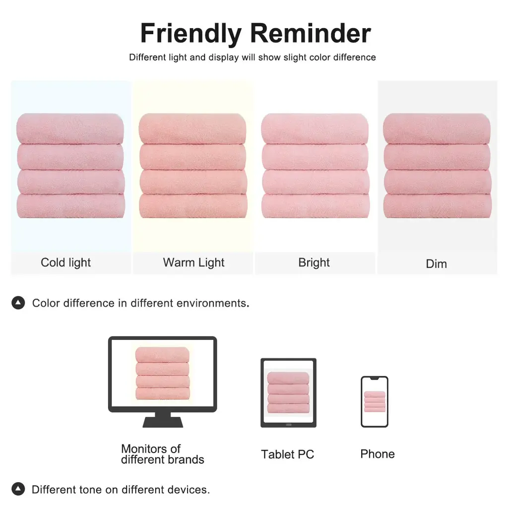 The bath towels is designed to provide users with all their basic bathroom drying needs to wrap around your hair or to dry your body. luxury bath towel makes all the difference in your experience. Our absorbent and soft bath towels better than your average towel is your best choice to upgrade home bathroom.Made of quality combed cotton, luffy and plush, while practical and highly absorbent.Cotton bath towels softer, makes the luxuriously gentle towels.Perfect for bath, gym, pool, beach, fitness and campingMachine washable. recommend washing in cold water before your first use.Tumble dry on low or hang them to dry. Please don’t use fabric softener, .Material: 100% CottonSize:70 x 140cm/27 x 54 inchColor: Pink, Cream, Blue, Gray, Steel Blue, BrownPackage include: 4pcs Cotton Bath TowelsGet softer and fluffier with every washDry quickly and odor resist, feel fresh and clean with every useSoft and highly absorbent, towel made from cotton is a beautiful and luxurious choicePerfect for pool, bathroom, beach, hotel, college dorm, spa, or gym useNote:Due to shotting setting, light, angle, different display screen effects, etc., there may be a slight color difference between picture and the actual product. please take the actual products color as the standard.