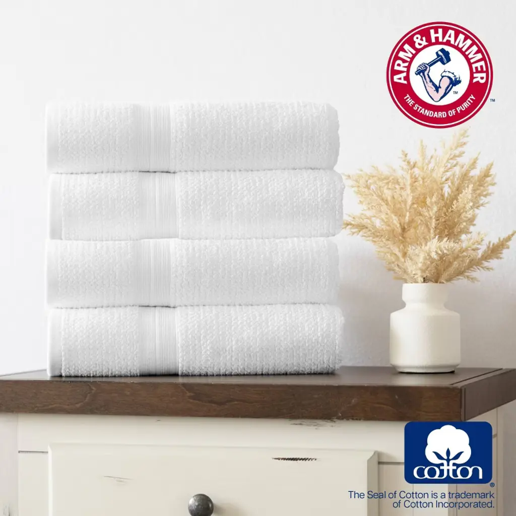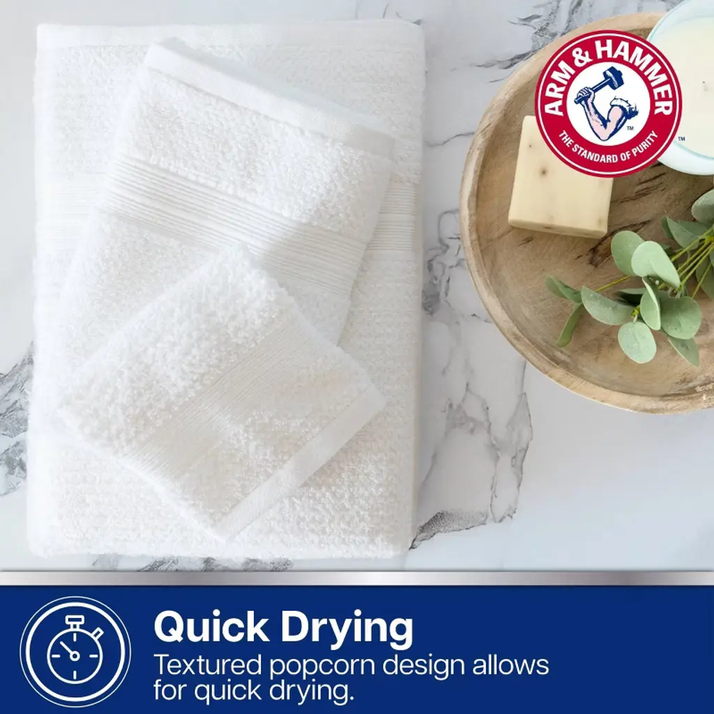 Experience the enduring luxury and convenience of Arm & Hammer™ Quick Dry Bath Towels. Crafted from 100% premium cotton, these towels dry fast in the dryer, with lasting softness and low lint performance. They maintain their pristine appearance with ease. Our built-in antimicrobial protection ensures these towels stay fresher for longer, effectively resisting mildew odors. Elevate your daily routine with towels that deliver exceptional performance and the trusted quality of the Arm & Hammer™ brand.