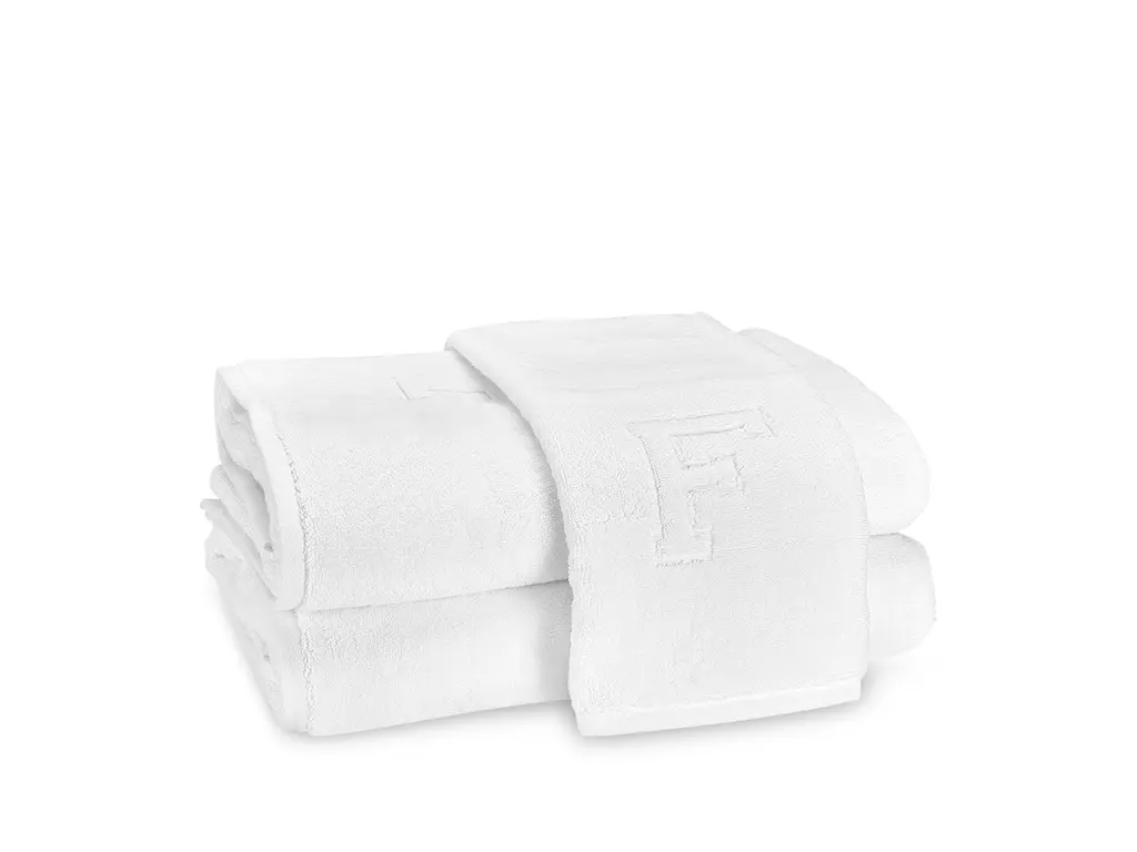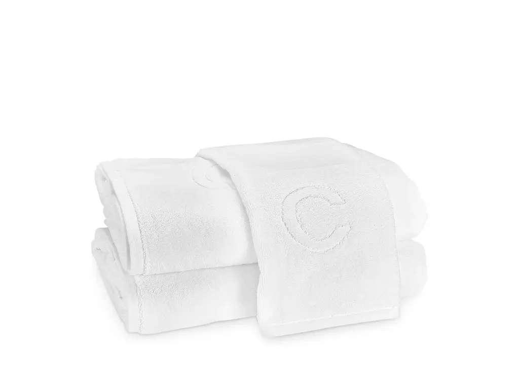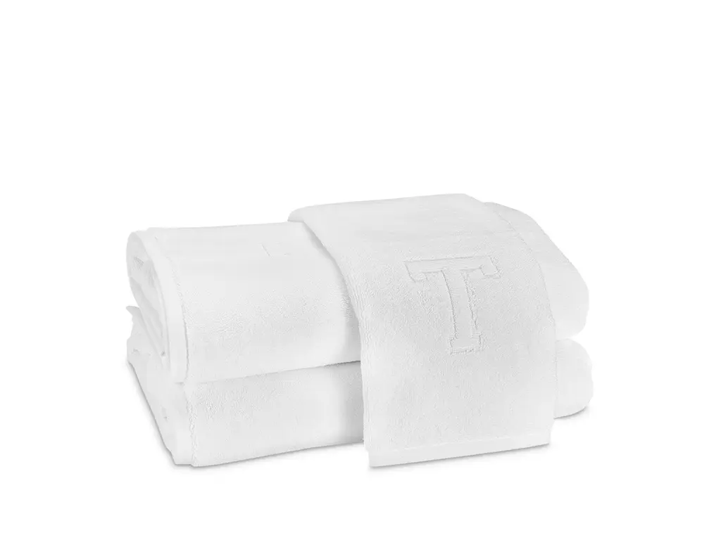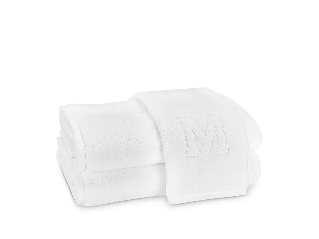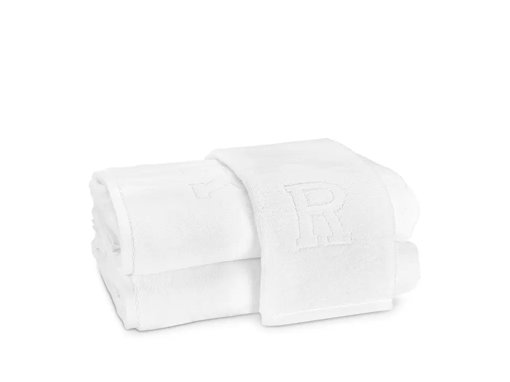 Soft, plush cotton terry towels featuring a bottom center decorative relief capital letter.