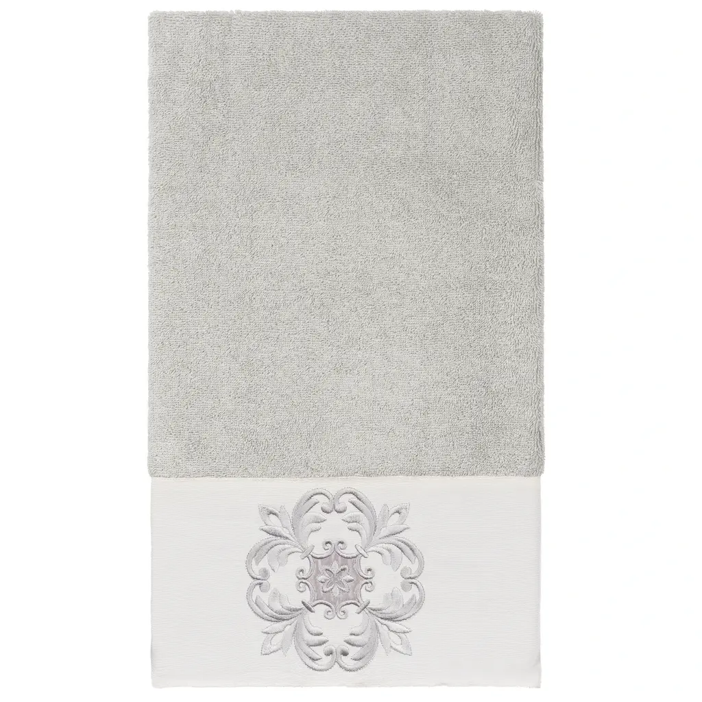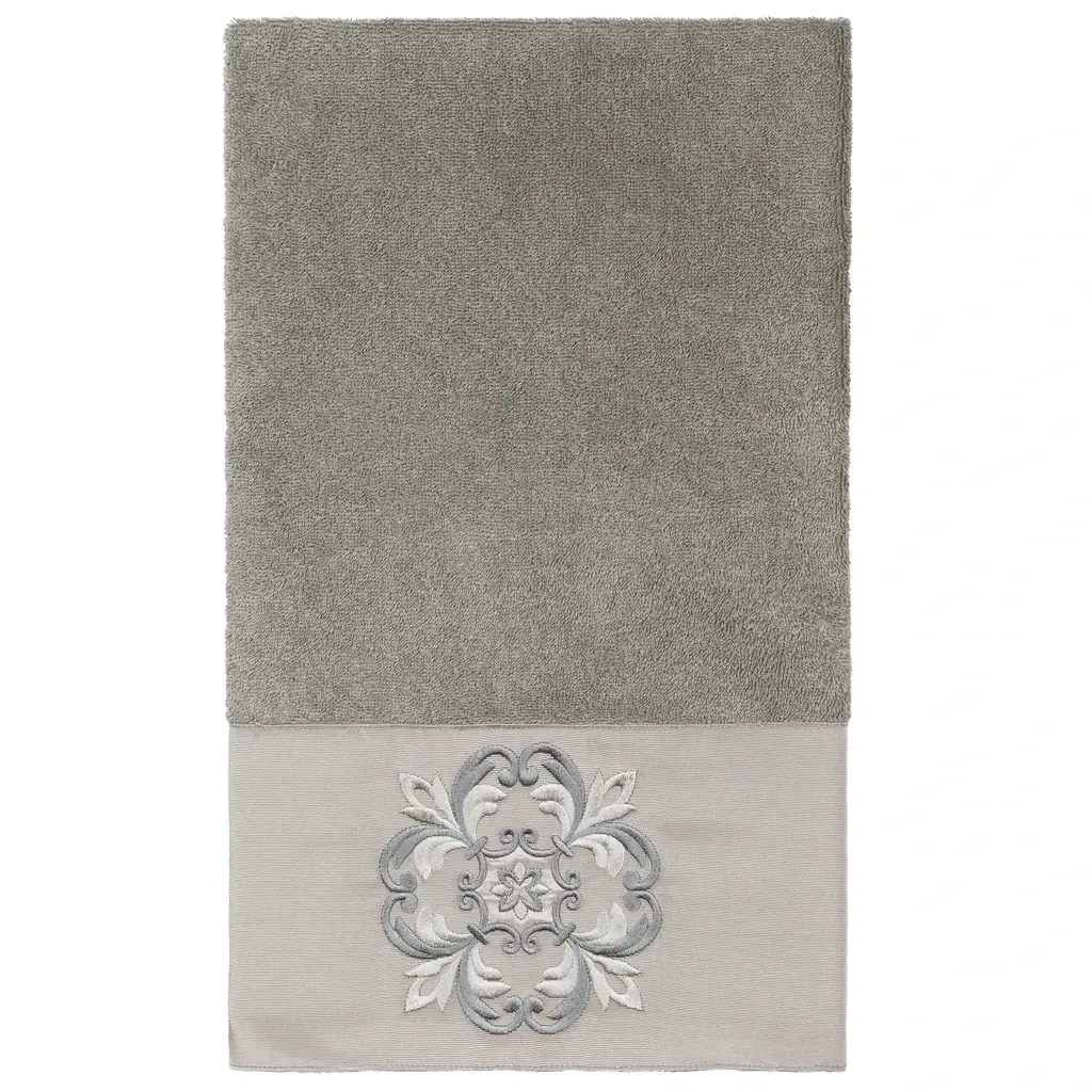 The Alyssa Embellished Towel Collection features a graceful tone on tone medallion motif embroidered on a lustrous bengaline border. These soft and luxurious towels are made of 100% premium Turkish Cotton and offer lasting absorbency and superior durability. 100% Premium Turkish Cotton Superbly absorbent and quick drying Available in a range of lovely towel colors Machine wash cold, No bleach, line dry or dry clean Includes 1 bath towel (27" x 54") Made in Turkey