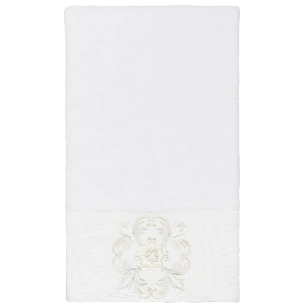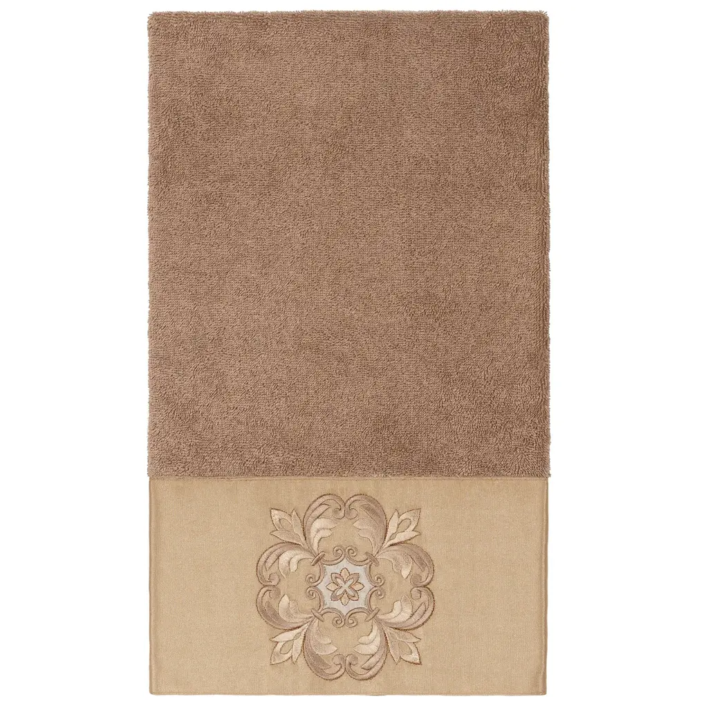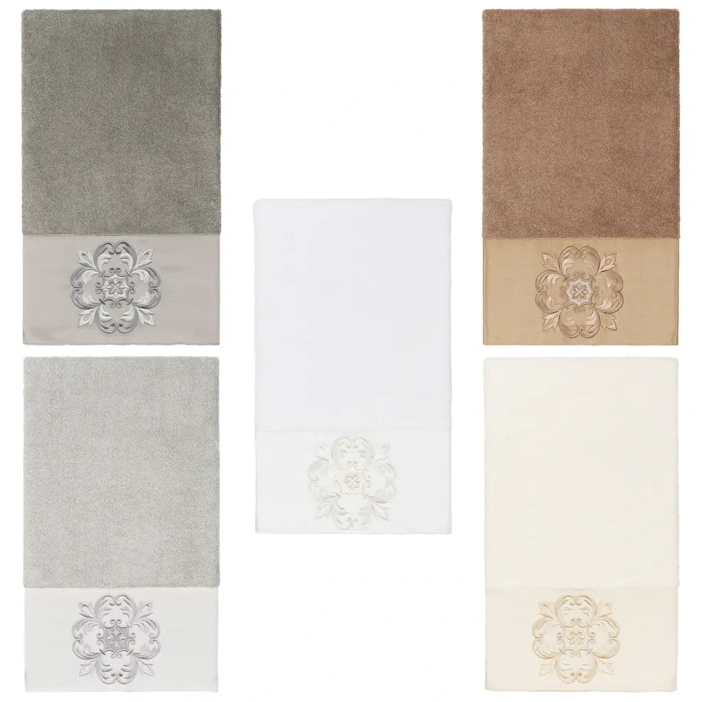 The Alyssa Embellished Towel Collection features a graceful tone on tone medallion motif embroidered on a lustrous bengaline border. These soft and luxurious towels are made of 100% premium Turkish Cotton and offer lasting absorbency and superior durability. 100% Premium Turkish Cotton Superbly absorbent and quick drying Available in a range of lovely towel colors Machine wash cold, No bleach, line dry or dry clean Includes 1 bath towel (27" x 54") Made in Turkey