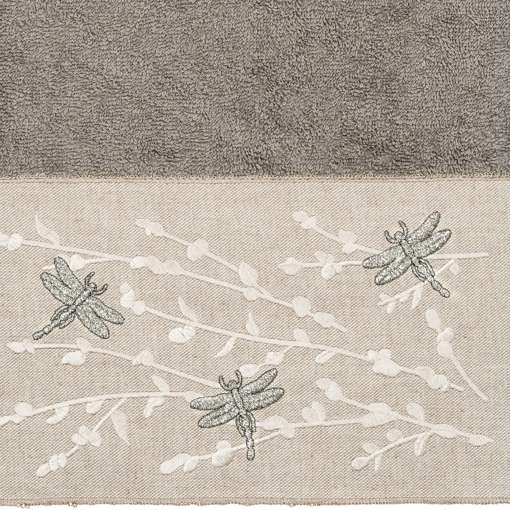 The Braelyn Embellished Towel Collection features glittering dragonflies flying among delicate branches embroidered on a linen-look textured woven cloth border. These soft and luxurious towels are made of 100% premium Turkish Cotton and offer lasting absorbency and superior durability.100% Premium Turkish Cotton Superbly absorbent and quick drying Available in a range of lovely towel colors Machine wash cold, No bleach, line dry or dry clean Includes 1 bath towel (27" x 54") Made in Turkey • Proudly Embellished in USA