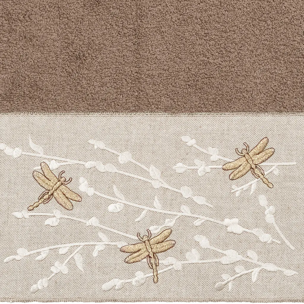 The Braelyn Embellished Towel Collection features glittering dragonflies flying among delicate branches embroidered on a linen-look textured woven cloth border. These soft and luxurious towels are made of 100% premium Turkish Cotton and offer lasting absorbency and superior durability.100% Premium Turkish Cotton Superbly absorbent and quick drying Available in a range of lovely towel colors Machine wash cold, No bleach, line dry or dry clean Includes 1 bath towel (27" x 54") Made in Turkey • Proudly Embellished in USA