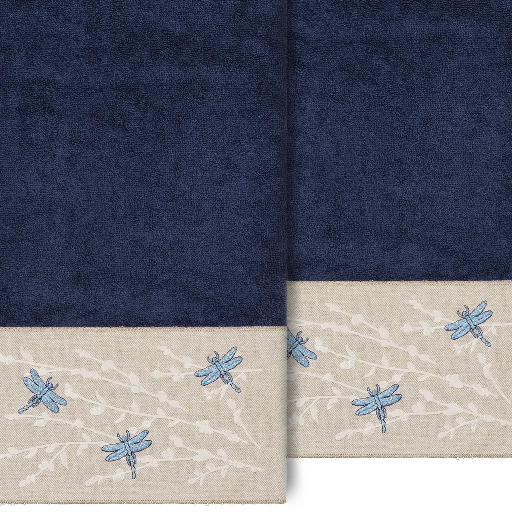 The Braelyn Embellished Towel Collection features glittering dragonflies flying among delicate branches embroidered on a linen-look textured woven cloth border. These soft and luxurious towels are made of 100% premium Turkish Cotton and offer lasting absorbency and superior durability.100% Premium Turkish Cotton Superbly absorbent and quick drying Available in a range of lovely towel colors Machine wash cold, No bleach, line dry or dry clean Set includes 2 bath towels (27" x 54") Made in Turkey • Proudly Embellished in USA