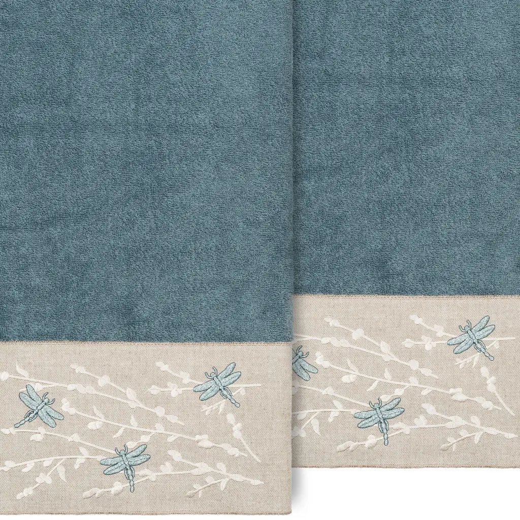 The Braelyn Embellished Towel Collection features glittering dragonflies flying among delicate branches embroidered on a linen-look textured woven cloth border. These soft and luxurious towels are made of 100% premium Turkish Cotton and offer lasting absorbency and superior durability.100% Premium Turkish Cotton Superbly absorbent and quick drying Available in a range of lovely towel colors Machine wash cold, No bleach, line dry or dry clean Set includes 2 bath towels (27" x 54") Made in Turkey • Proudly Embellished in USA