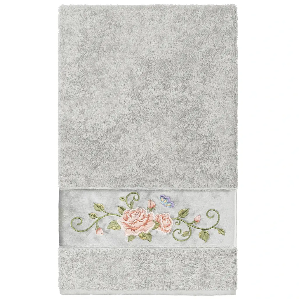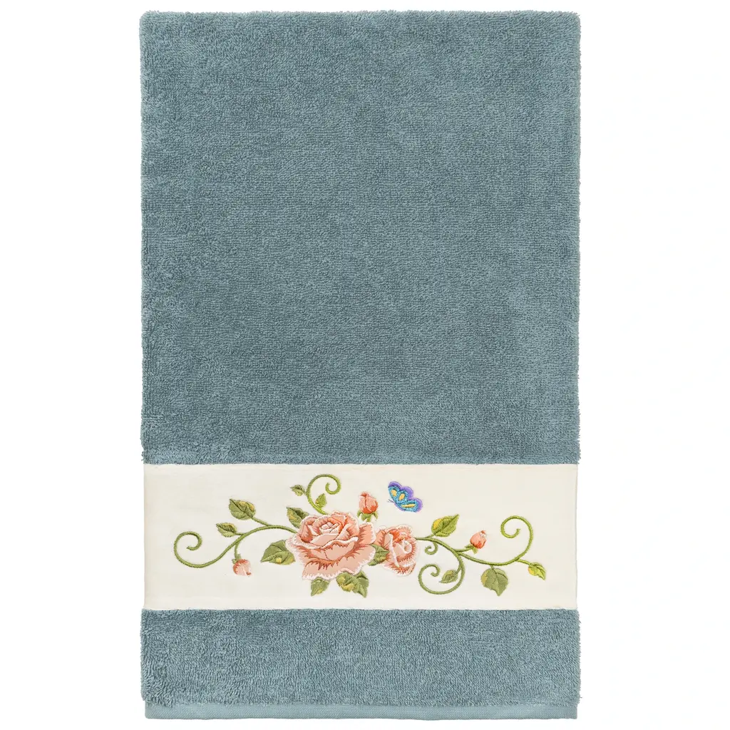 The Rebecca Embellished Towel Collection features a romantic rose & butterfly motif embroidered on a rich velvet border. These soft and luxurious towels are made of 100% premium Turkish Cotton and offer lasting absorbency and superior durability. 100% Premium Turkish Cotton Superbly absorbent and quick drying Available in a range of lovely towel colors Machine wash cold, No bleach, line dry or dry clean Includes 1 bath towel (27" x 54") Made in Turkey