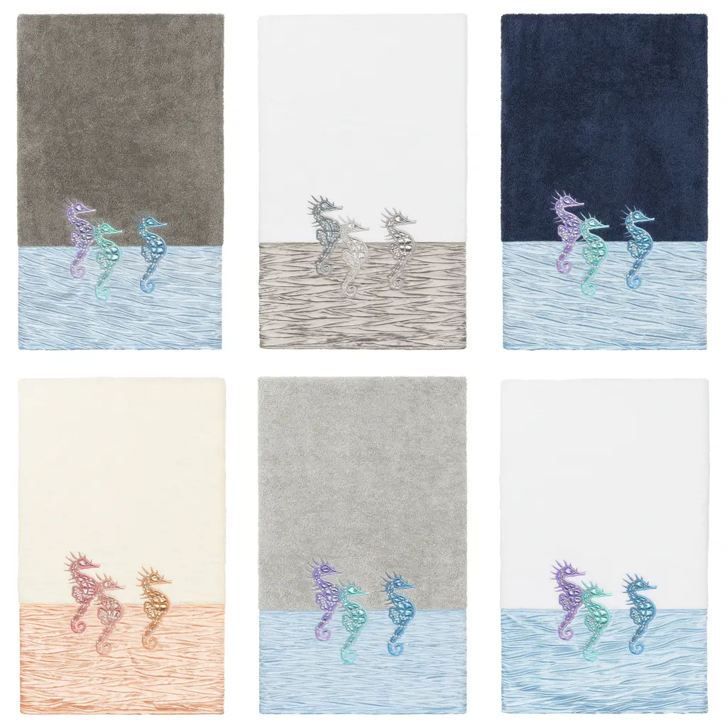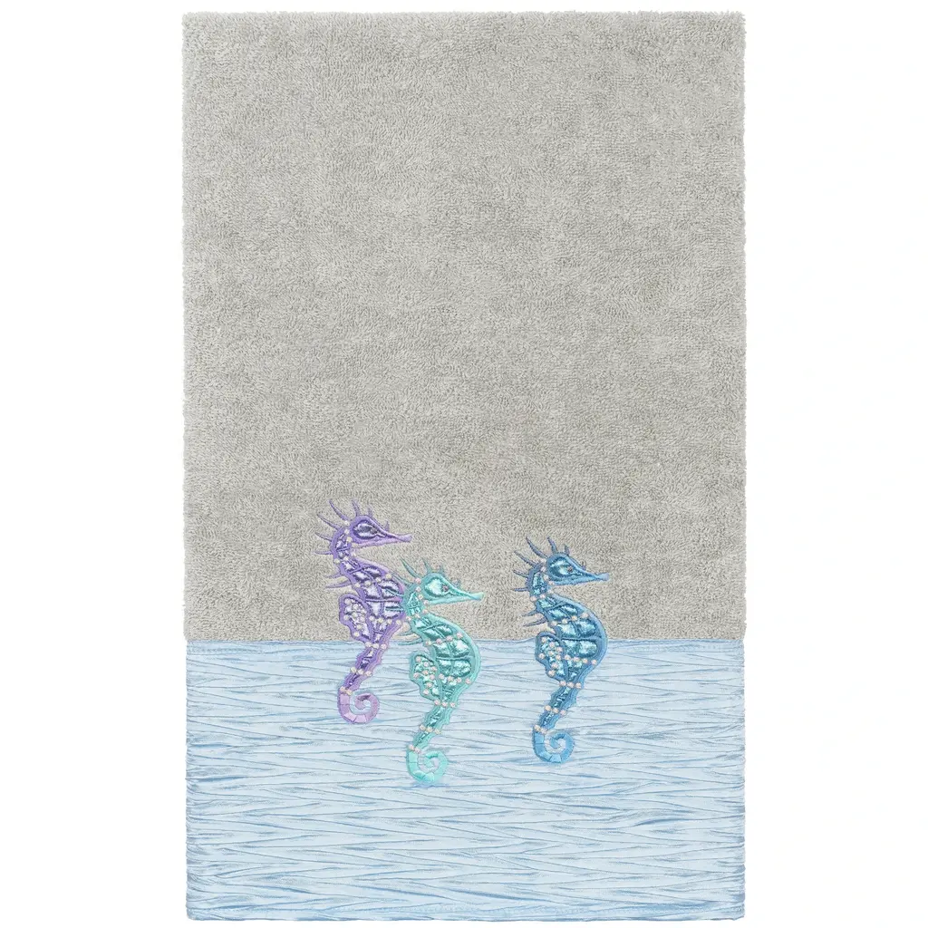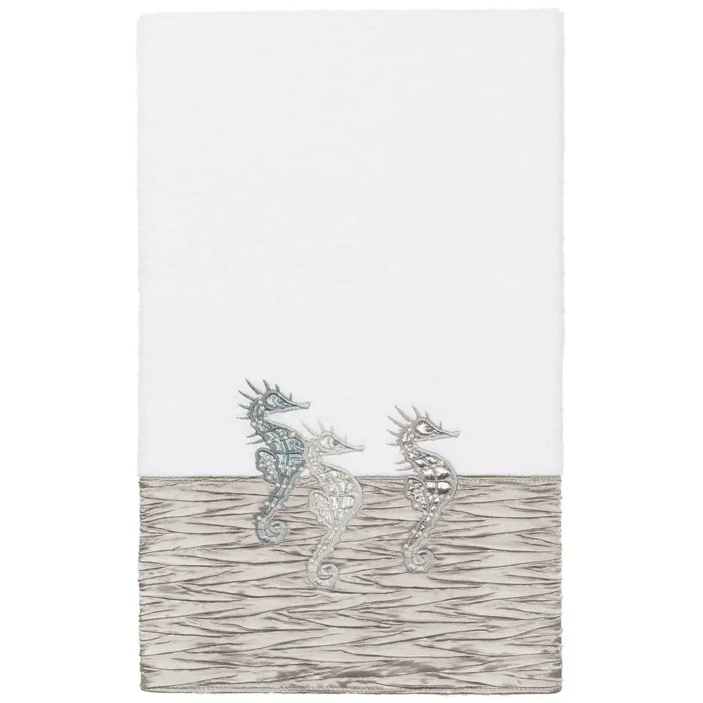 The Sofia Embellished Towel Collection features sparkling seahorses embroidered on a lustrous pleated border. These soft and luxurious towels are made of 100% premium Turkish Cotton and offer lasting absorbency and superior durability.100% Premium Turkish Cotton Superbly absorbent and quick drying Available in a range of lovely towel colors Machine wash cold, No bleach, line dry or dry clean Includes 1 bath towel (27" x 54") Made in Turkey