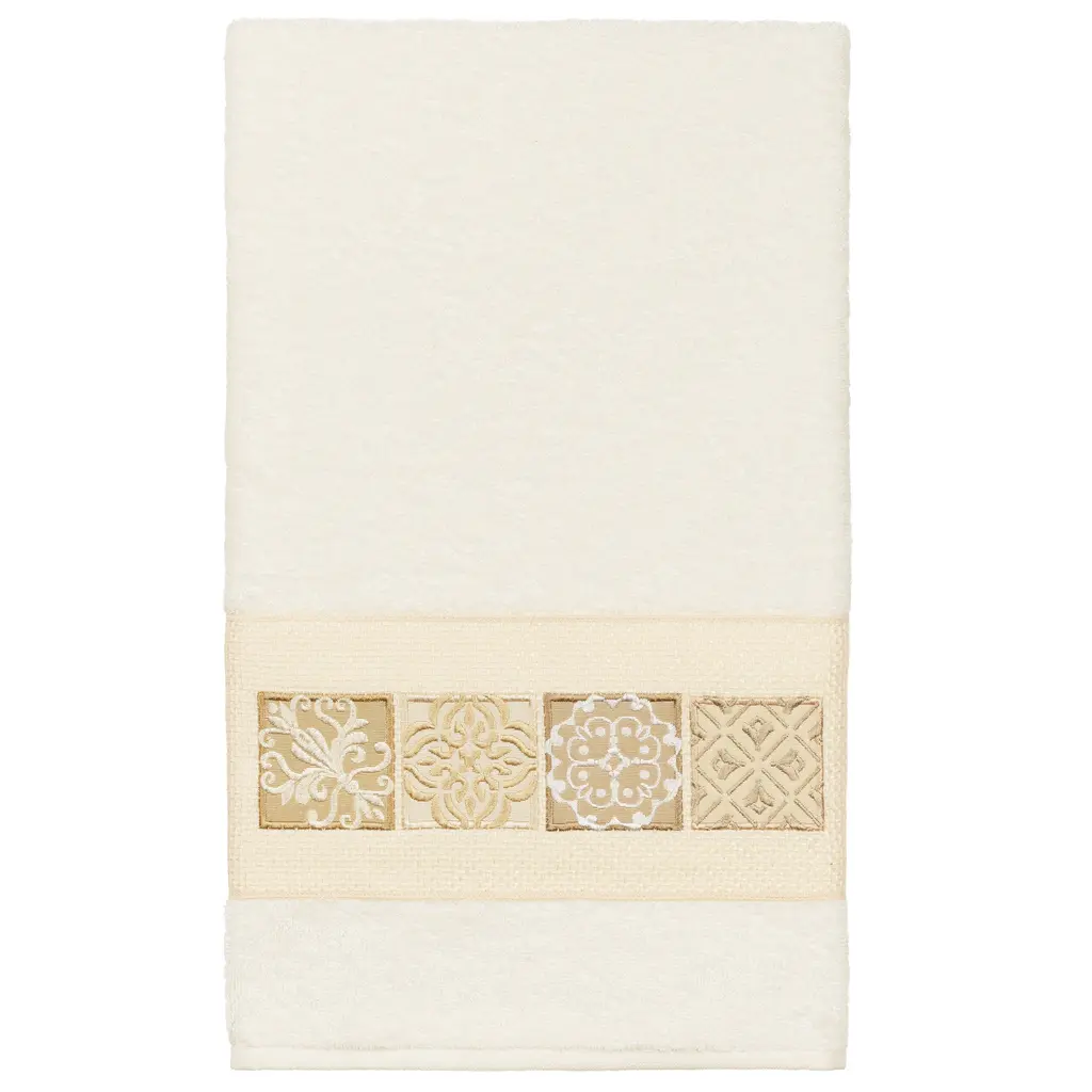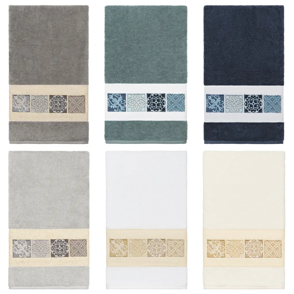 The Vivian Embellished Towel Collection features a classic tile pattern embroidered on a woven textured border. These soft and luxurious towels are made of 100% premium Turkish Cotton and offer lasting absorbency and superior durability.100% Premium Turkish Cotton Superbly absorbent and quick drying Available in a range of lovely towel colors Machine wash cold, No bleach, line dry or dry clean Includes 1 bath towel (27" x 54") Made in Turkey