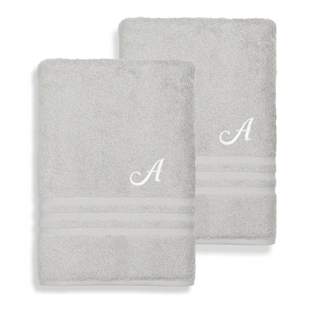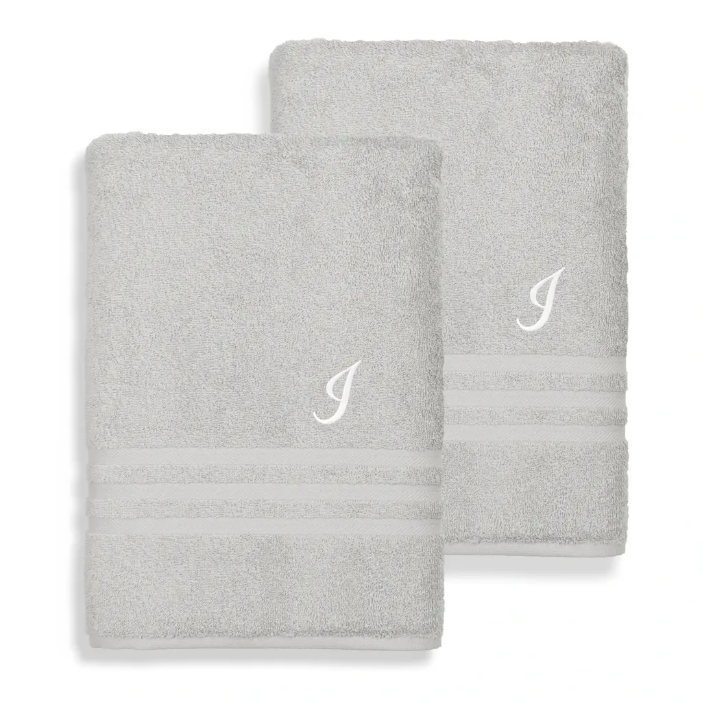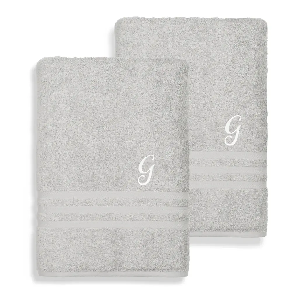 Personalize these towels with the initial of your choice for a custom look in your bathroom. These towels feature thirsty Turkish cotton terry construction to help you dry off fast. Includes set of two (2) bath towelsSoft, thick and very absorbentLong-lasting towels designed for heavy useBecome softer with each washWill not pill or shedPattern: Grey solid terry with an embroidered white script initial of your choiceMaterials: 100 percent Turkish cottonCare instructions: Machine washableMade in TurkeyBath Towel: 27 inches wide x 54 inches longSet Includes: 2 PieceProduct Features: Monogrammed, Eco-FriendlyMaterial: Turkish CottonPattern: Solid Color, EmbroideredCare Instruction: Machine WashTowel: Bath Towels, Towel Sets, DecorativeColor: White, Grey