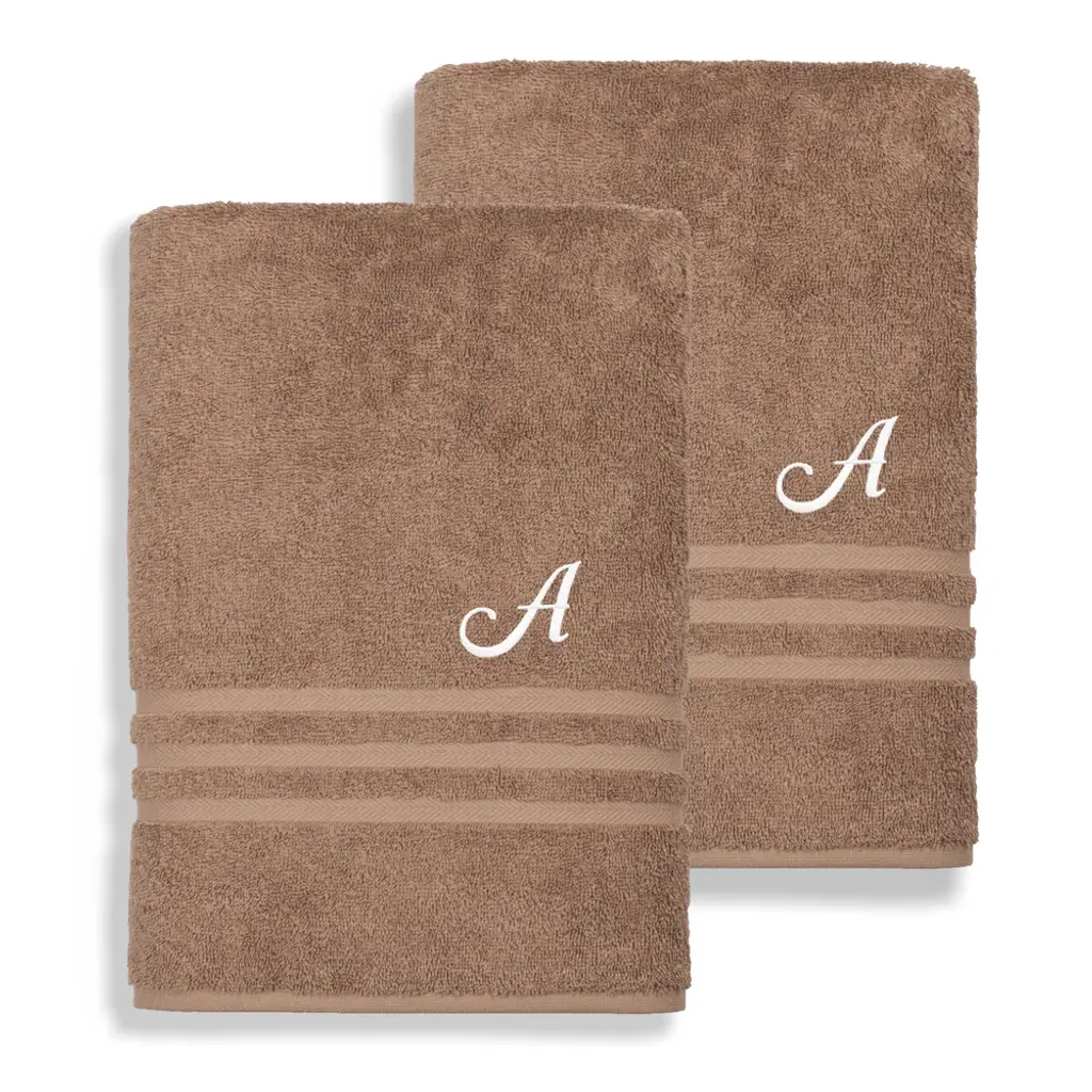 Bring the spa experience to your home with this monogrammed lush bath towel set. Made from Turkish cotton, these latte brown towels get softer with each use to provide an elegant, personalized experience for years to come. Details:Set includes 2 bath towelsSoft, thick and very absorbentLong-lasting towels designed for heavy useBecome softer with each washWill not pill or shedLatte brown solid terry with an embroidered white script initial of your choice100-percent Turkish cottonMachine washableMade in TurkeyBath towel measures 27 inches wide x 54 inches long