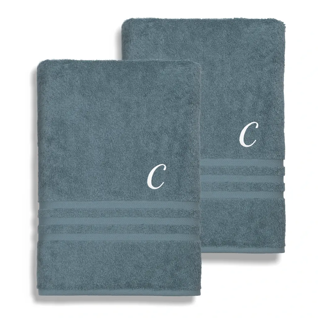 Authentic Hotel And Spa Omni Turkish Cotton Terry Set Of 2 Medium Blue Bath Towels With White Script Monogrammed Initial - C