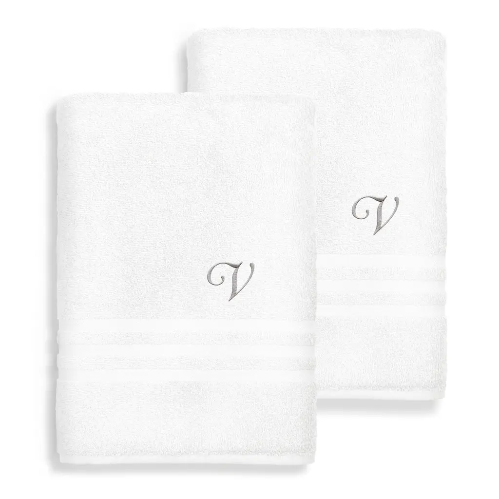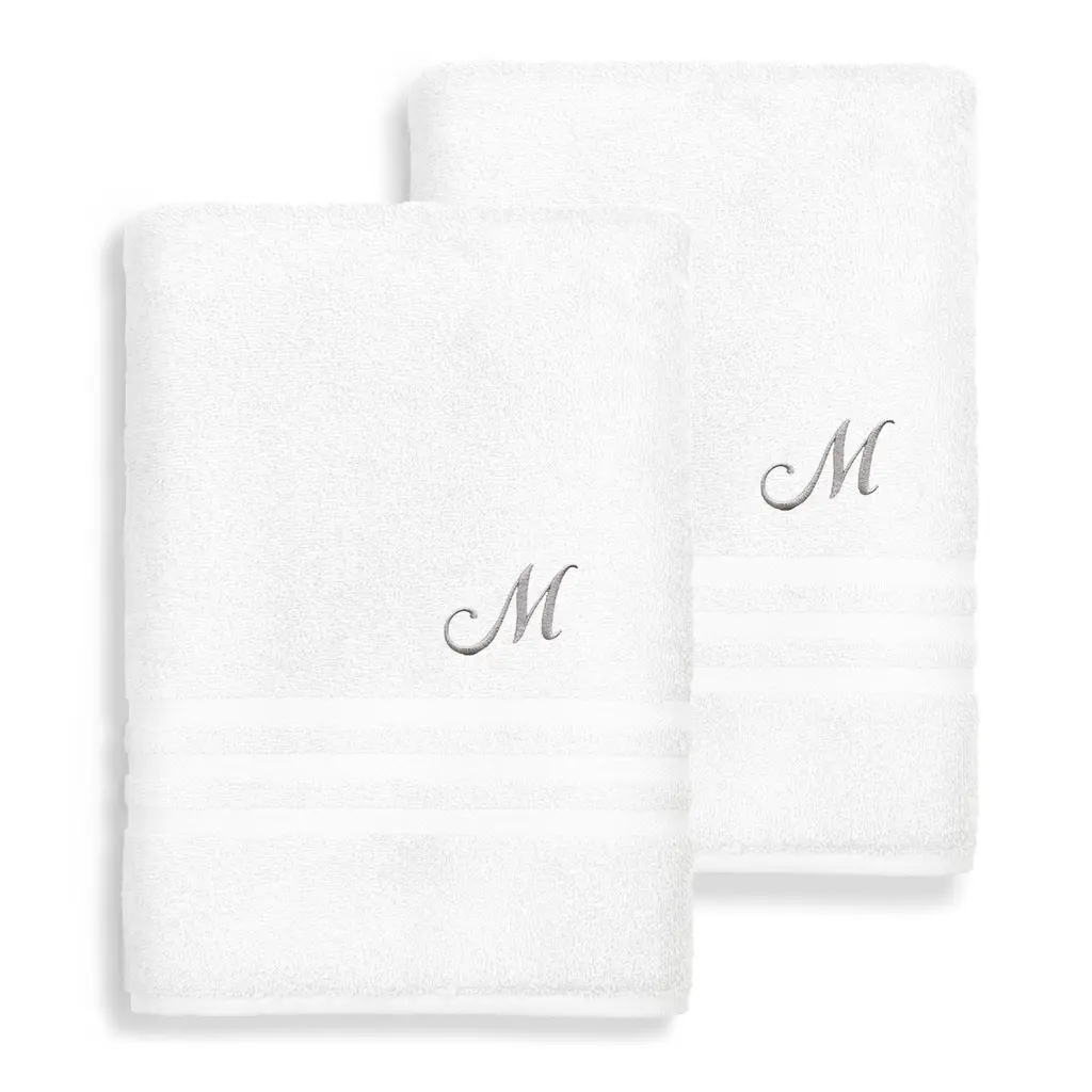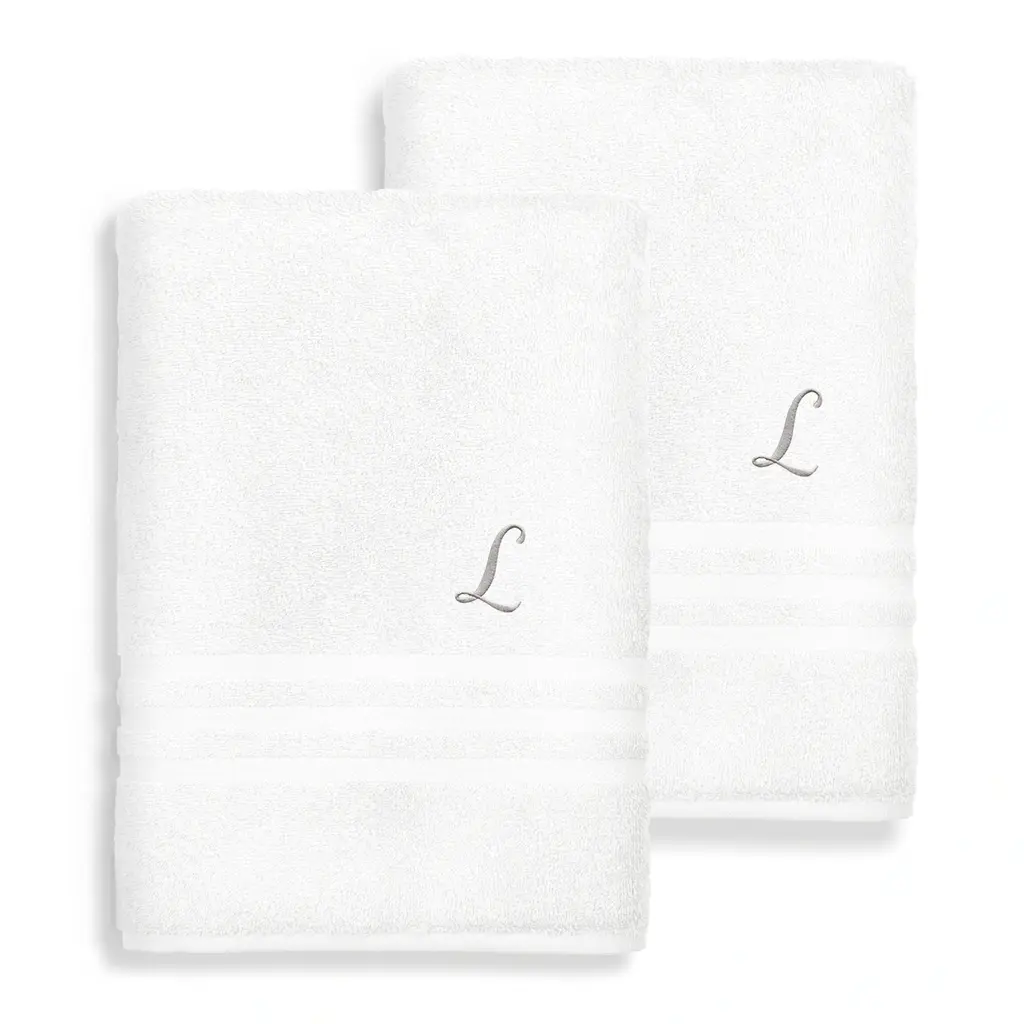 Authentic Hotel And Spa Omni Turkish Cotton Terry Set Of 2 White Bath Towels With Grey Script Monogrammed Initial - White/a