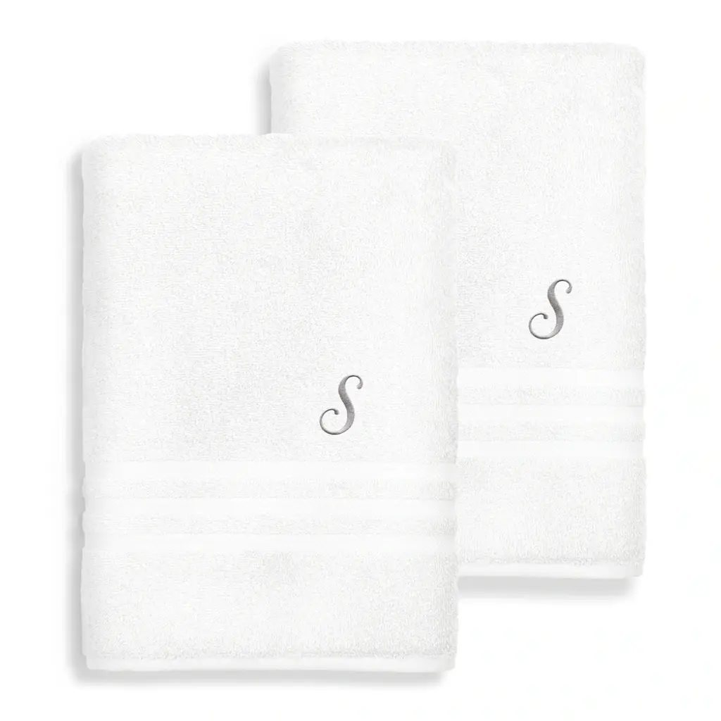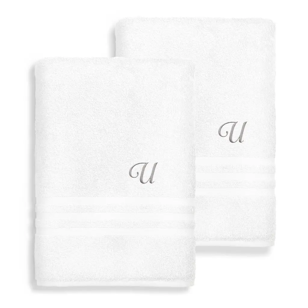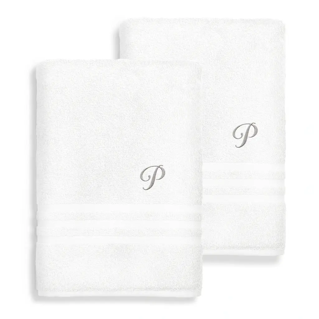 Wrap yourself in luxury with this set of two white bath towels from Authentic Hotel and Spa. Made from 100% Turkish cotton, these towels are soft, thick, and highly absorbent, perfect for a spa-like experience every time you use them. The towels are designed for heavy use and will become softer with each wash without pilling or shedding, ensuring long-lasting beauty and functionality. Featuring a grey script monogrammed initial, these towels are both personalized and eco-friendly. Elevate your daily routine with these premium quality towels.Features:Other sections: