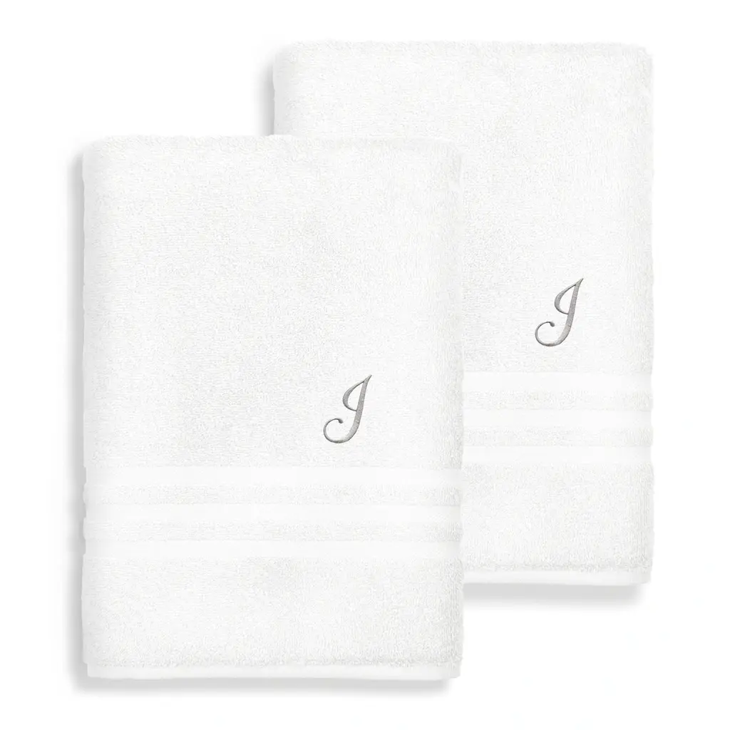 Authentic Hotel And Spa Omni Turkish Cotton Terry Set Of 2 White Bath Towels With Grey Script Monogrammed Initial - White/g