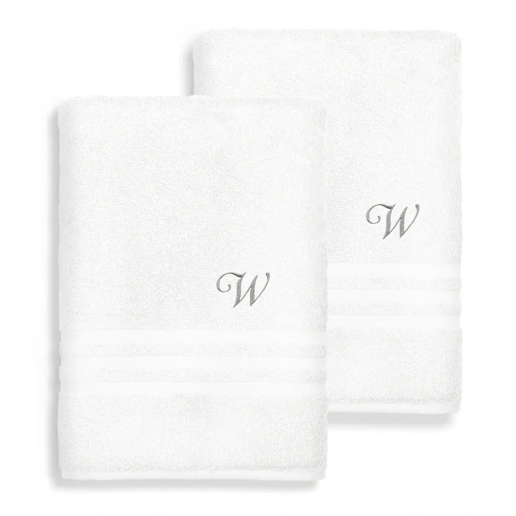 Authentic Hotel And Spa Omni Turkish Cotton Terry Set Of 2 White Bath Towels With Grey Script Monogrammed Initial - White/j