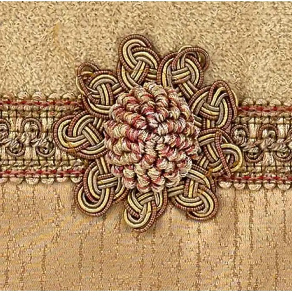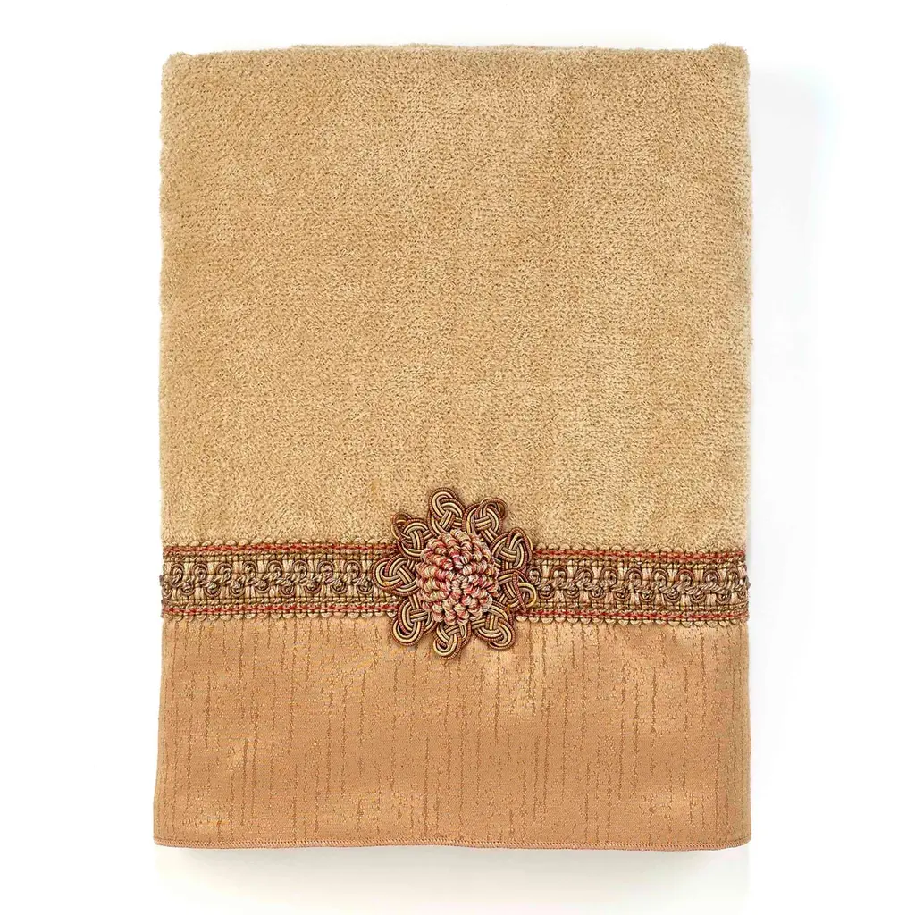 The Avanti Braided Cuff Rattan Decorative Embellished Bath Towel features a gold tonal striped jacquard fabric finished with a coordinating top braid and center medallion. 27" x 50" 100% cotton rattan velour towel. Coordinating shower curtain, accessories and rug also available.