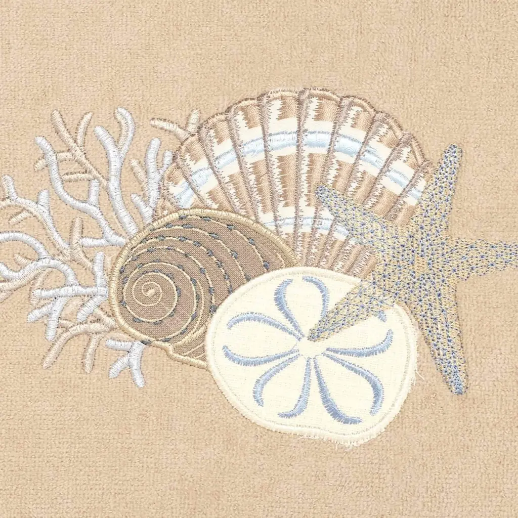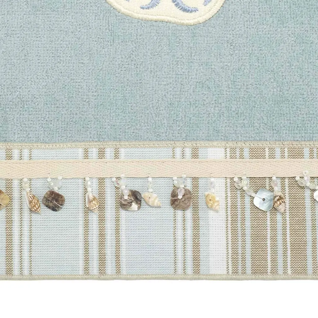 The Avanti By the Sea Rattan Decorative Embellished Bath Towel is embroidered with a variety of shells, starfish and coral in blues and beiges. Finished with a coordinating striped cotton border with real shell trim. The 100% cotton rattan velour towel measures 27" x 50" with a super soft feel.
