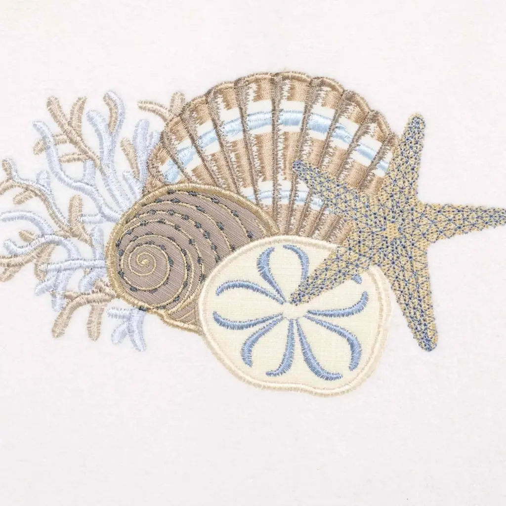 The Avanti By the Sea White Decorative Embellished Bath Towel is embroidered with a variety of shells, starfish and coral in blues and beiges. Finished with a coordinating striped cotton border with real shell trim. The 100% cotton white velour towel measures 27" x 50" with a super soft feel.