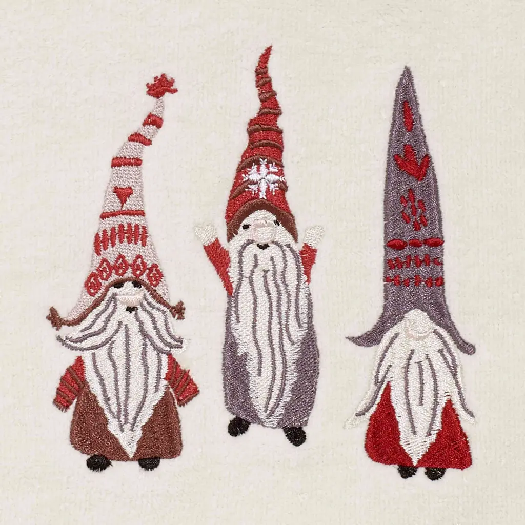 The Avanti Christmas Gnomes Bath Towel features 3 embroidered festively dressed gnomes on a 100% cotton (exclusive of embellishment and border) ivory velour towel. Towel is finished with a coordinating red polyester border.