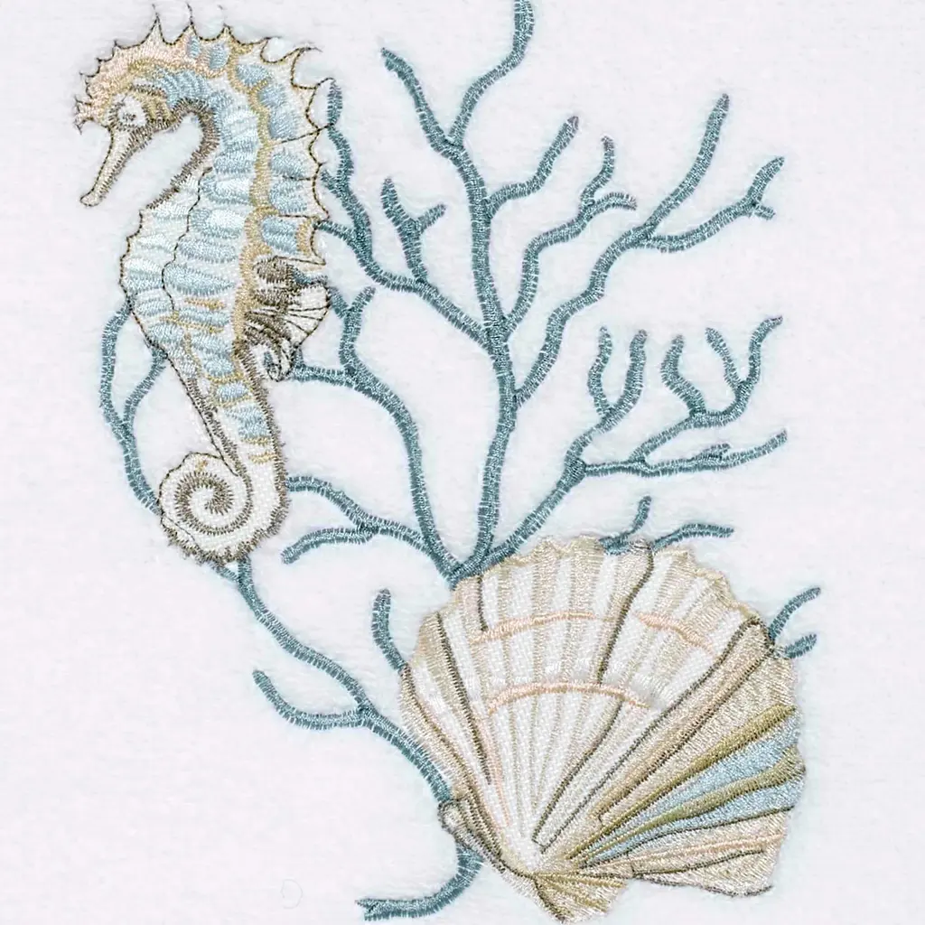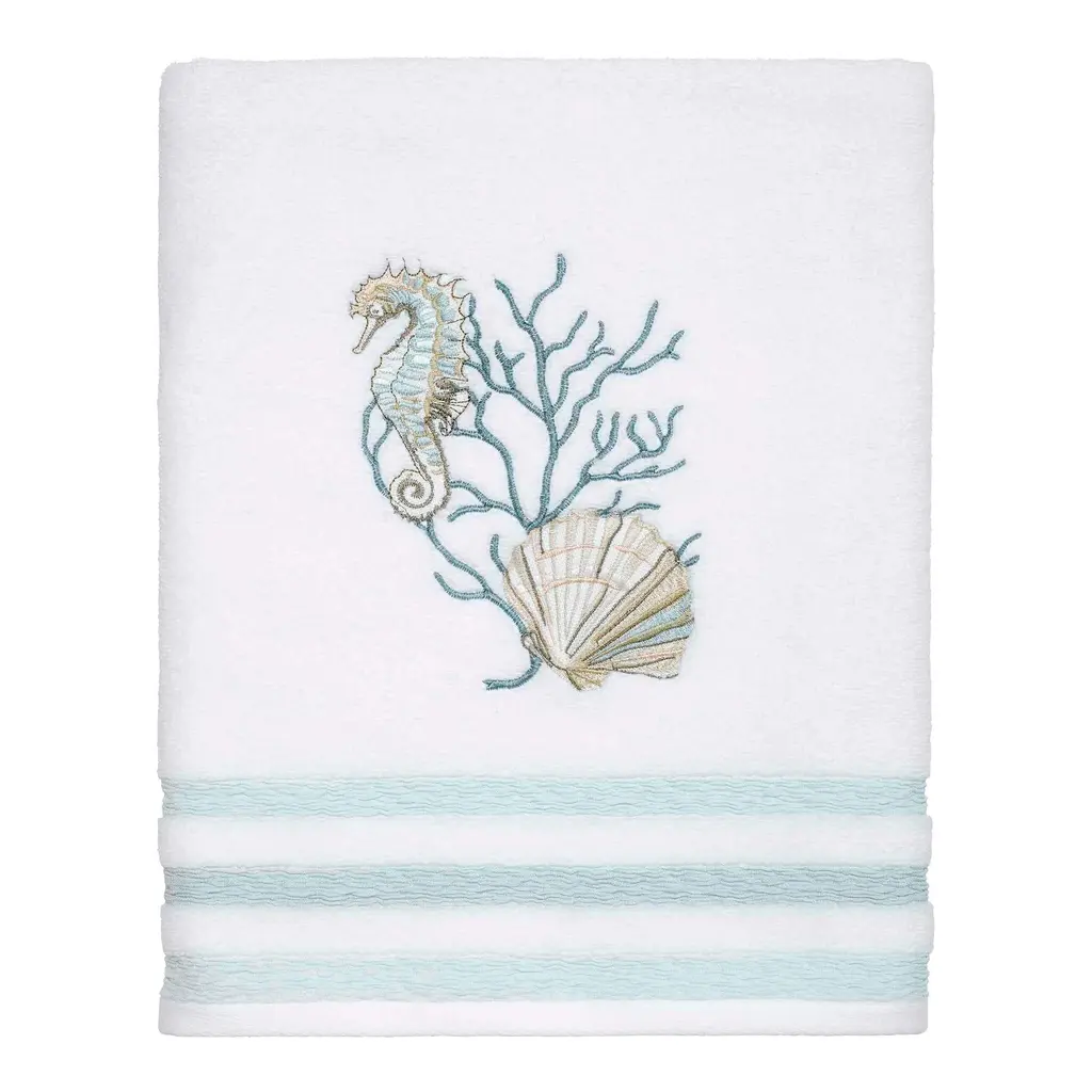 The Avanti Coastal Terrazzo White Decorative Bath Towel feature an embroidered seahorse, shells and coral in shades of blue and tan. Plush 27" x 52" 100% cotton (excl of embellishment) white terry towel is finished with woven light blue stripes. Accessories, shower curtain and rug available.