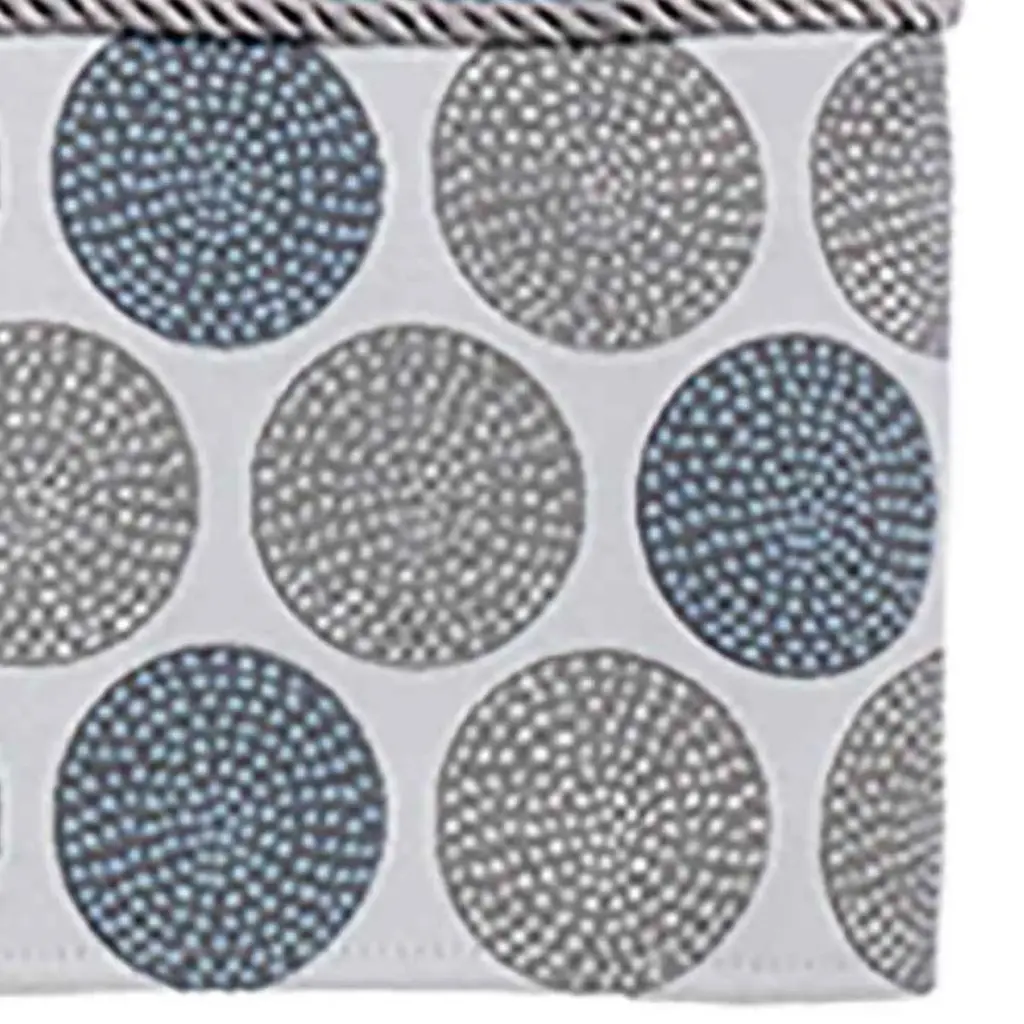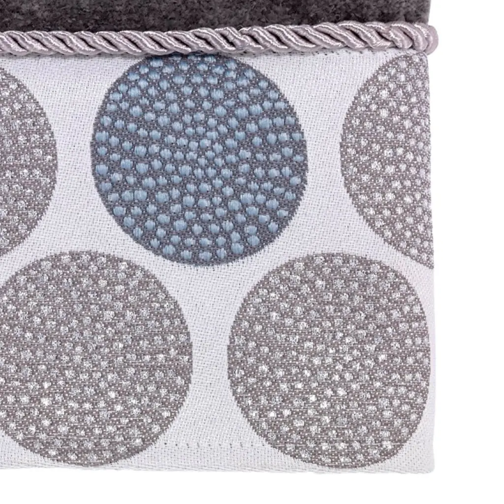 The Avanti Dotted Circles Mineral Bath Towel features a jacquard woven border with medium grey and slate blue circles and metallic accents, finished with a matching grey rope trim. The 100% cotton mineral velour towel measures 27" x 50". Coordinating accessories, rug, shower curtain available.