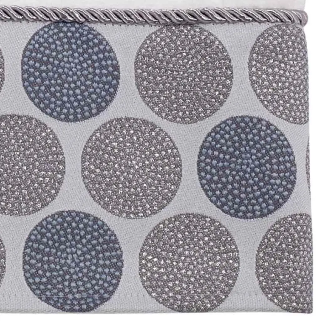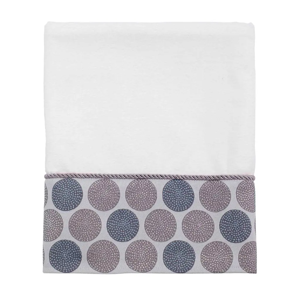 The Avanti Dotted Circles White Bath Towel features a jacquard woven border with medium grey and slate blue circles and metallic accents, finished with a matching grey rope trim. The 100% cotton white velour towel measures 27" x 50". Coordinating accessories, rug, shower curtain available.