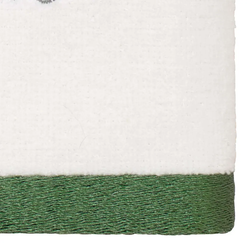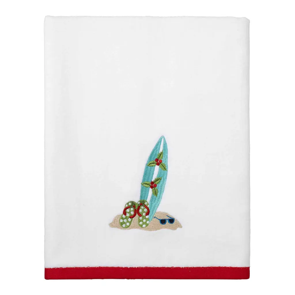 The Avanti Flamingo Jingle Decorative Bath Towel features an embroidered blue surfboard with holly, green and white polka dot flip flops and sunglasses on sand. The white 100% cotton velour towel is finished with a coordinating red polyester border. 27" x 50", machine washable.