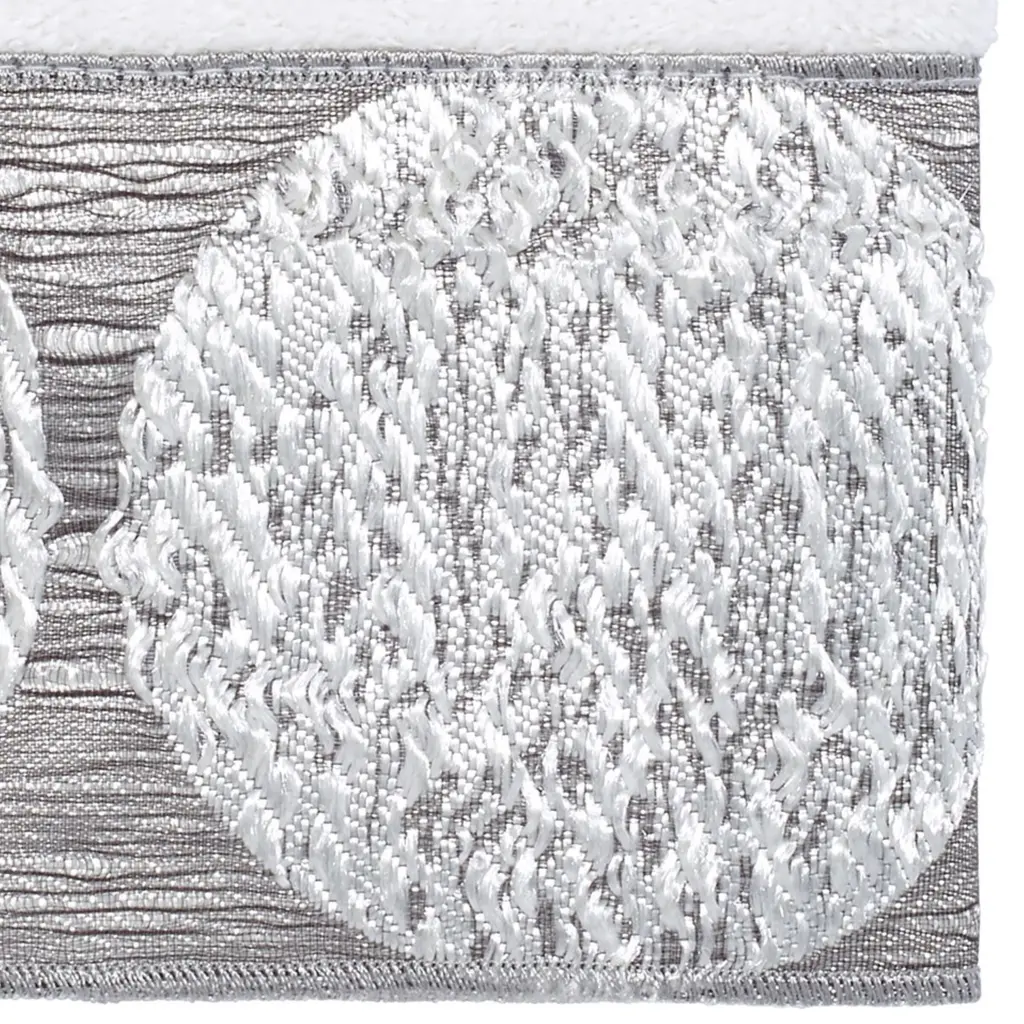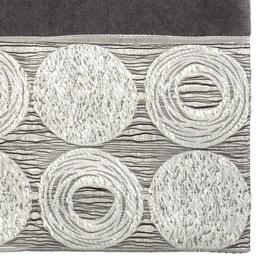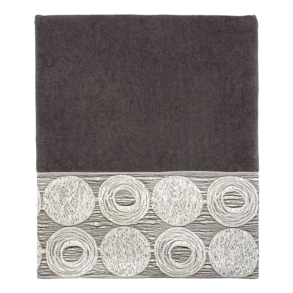 The Avanti Galaxy Granite Decorative Bath Towel features a contemporary jacquard woven metallic border design with irregular circles in shades of silvers and greys. Granite velour 27" x 50" towel is made of 100% cotton for silky soft feel. Other sizes and colors available.